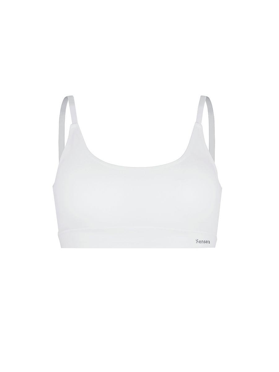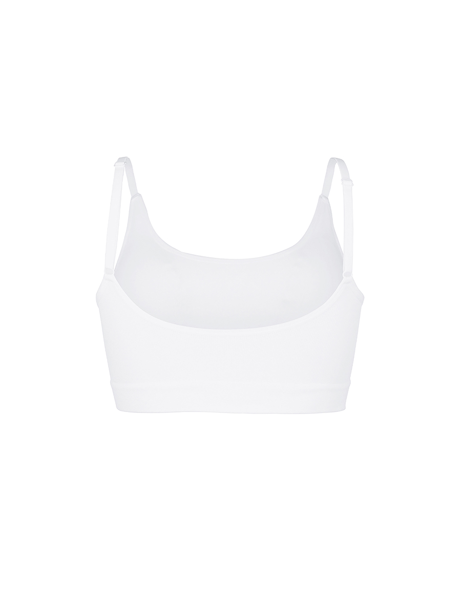 Бюстгальтер-топ из эластичного рибового полотна в вертикальный рубчик с мягким подкладом и съемными вкладышами. Без каркасов и боковых корсетных вставок. Регулируемые не съемные тонкие бретели.. Брендированная лента под грудью.