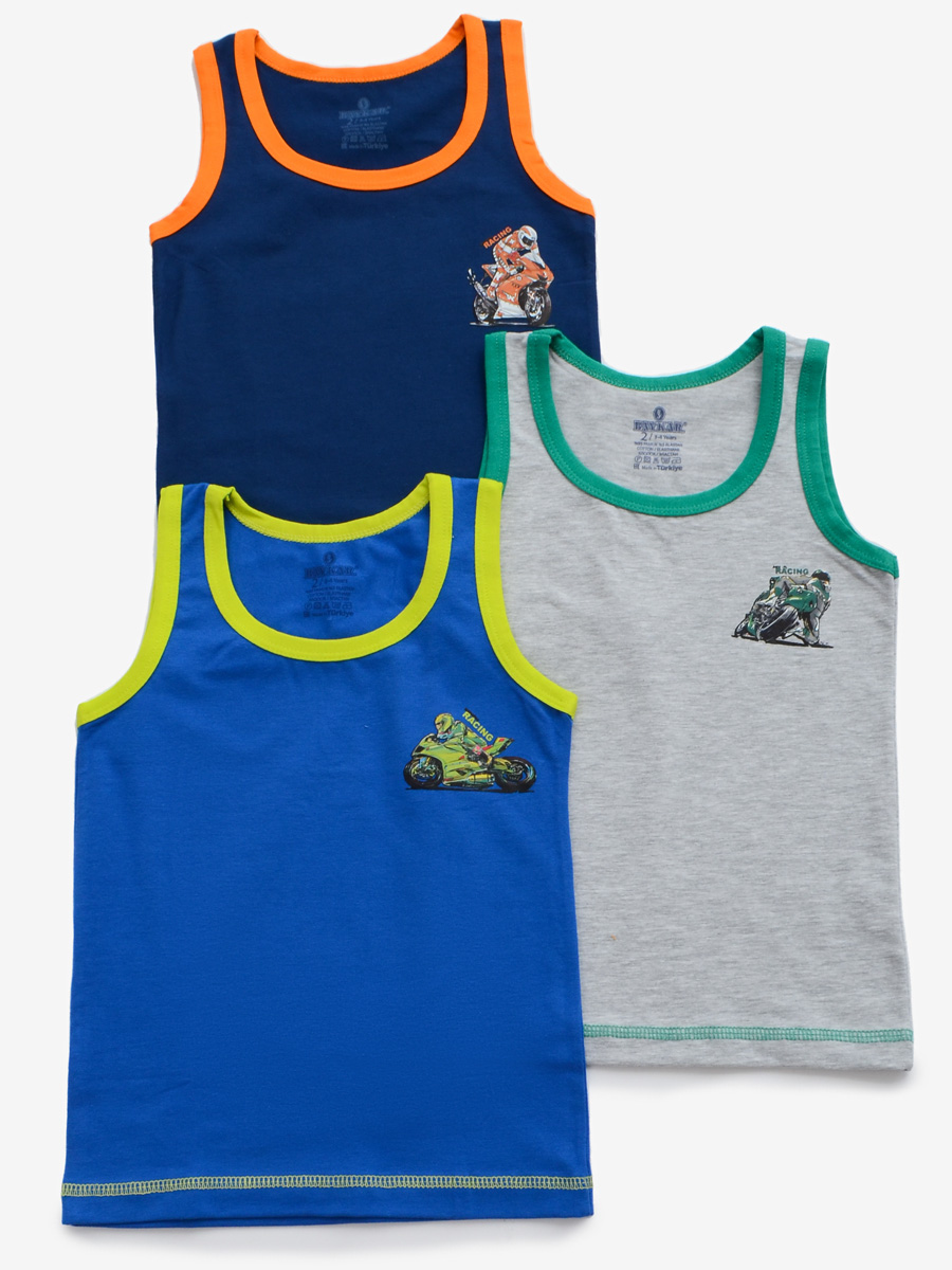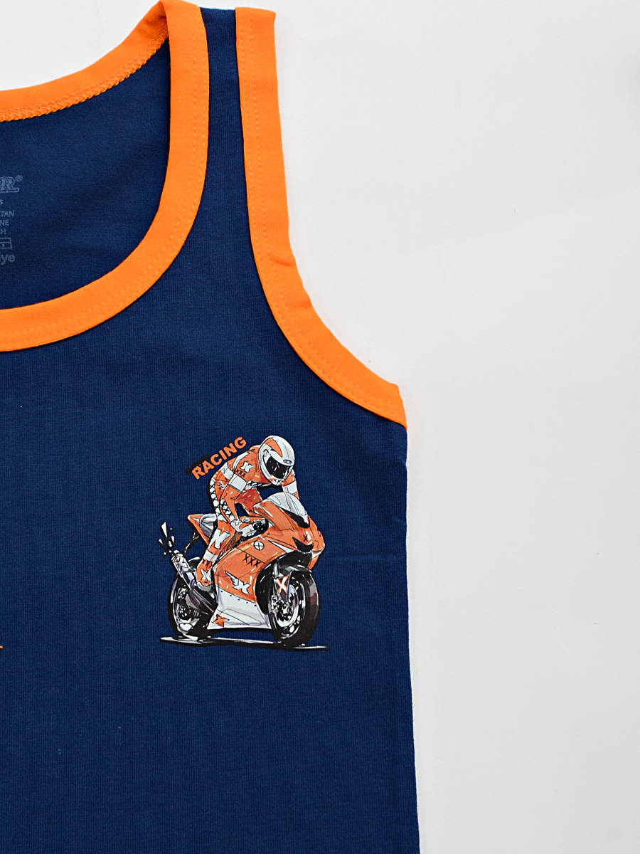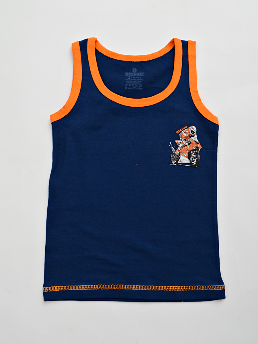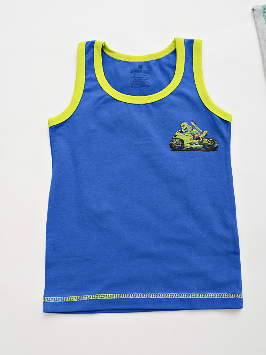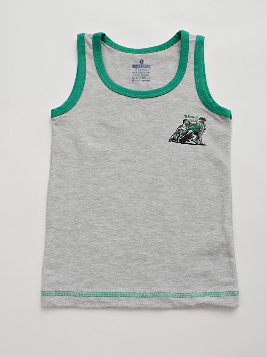 Майка для мальчика из эластичного х/б трикотажа, с рисунком. Горловина и проймы отделаны трикотажным кантом.