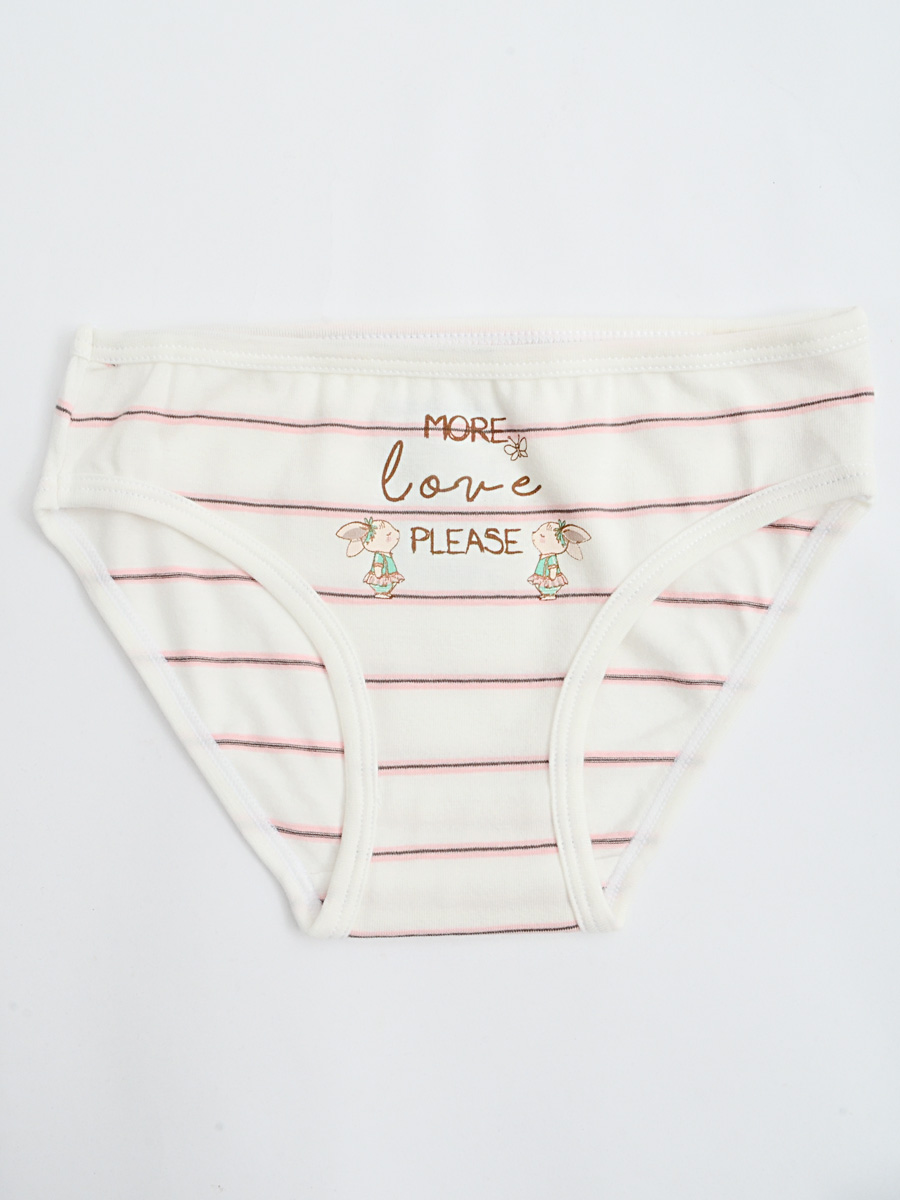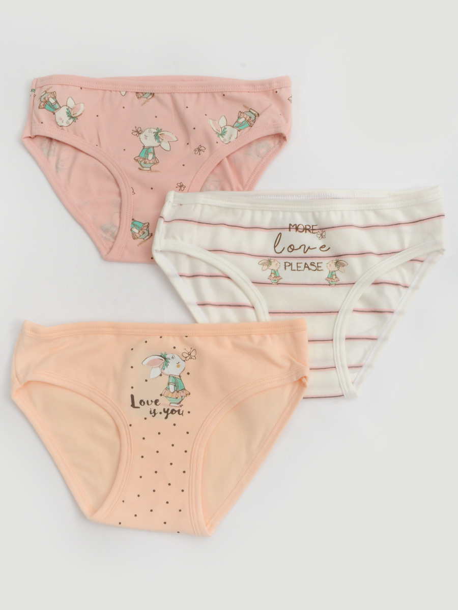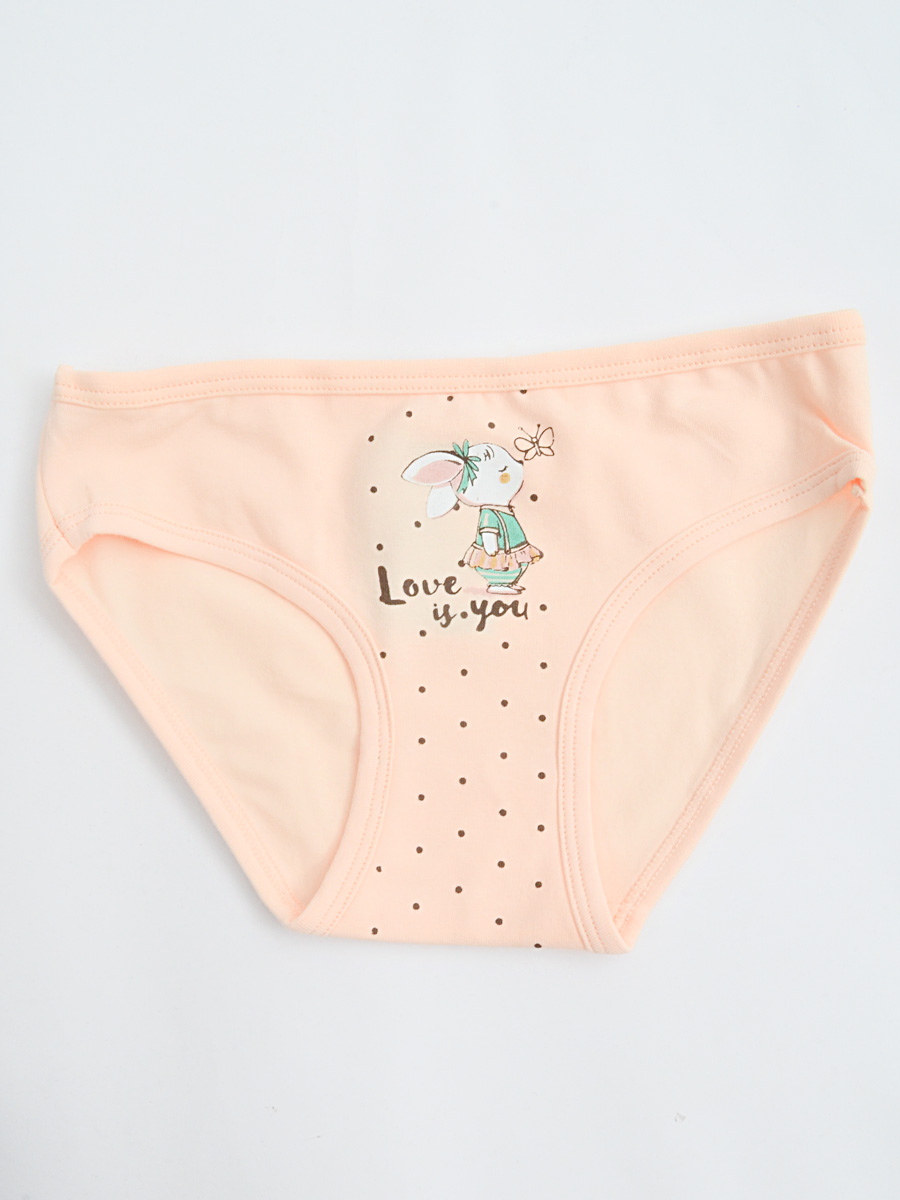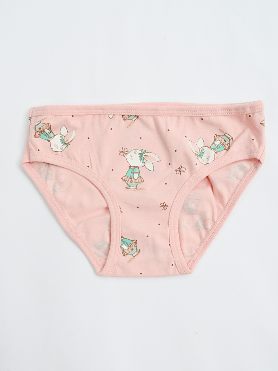 Трусы-слипы для девочки. Выполнены из эластичного х/б трикотажа кулирное полотно. Декорированы принтом "Зайки". В поясе и проймах отделаны эластичным трикотажным кантом. Ластовица из хлопка.