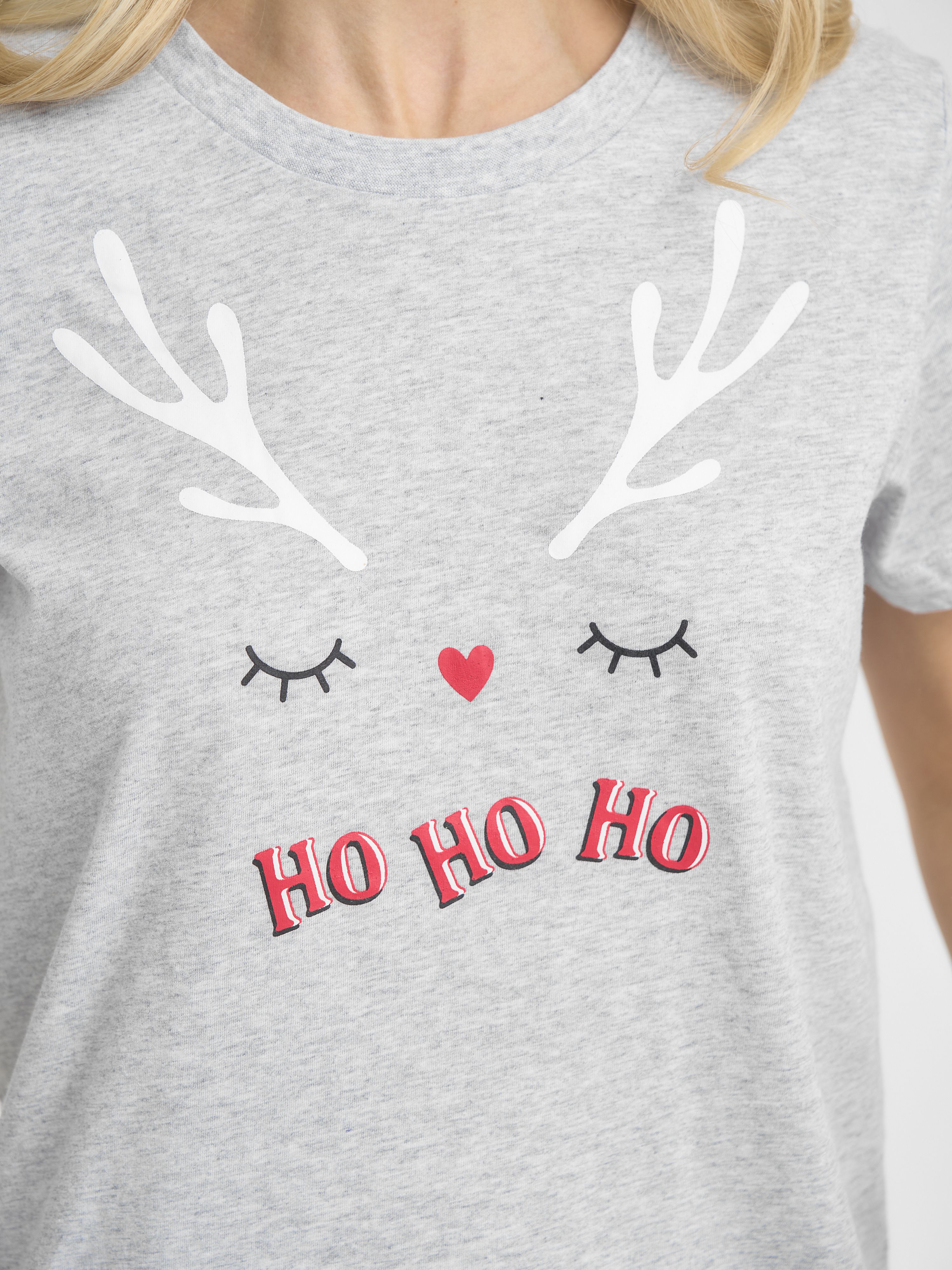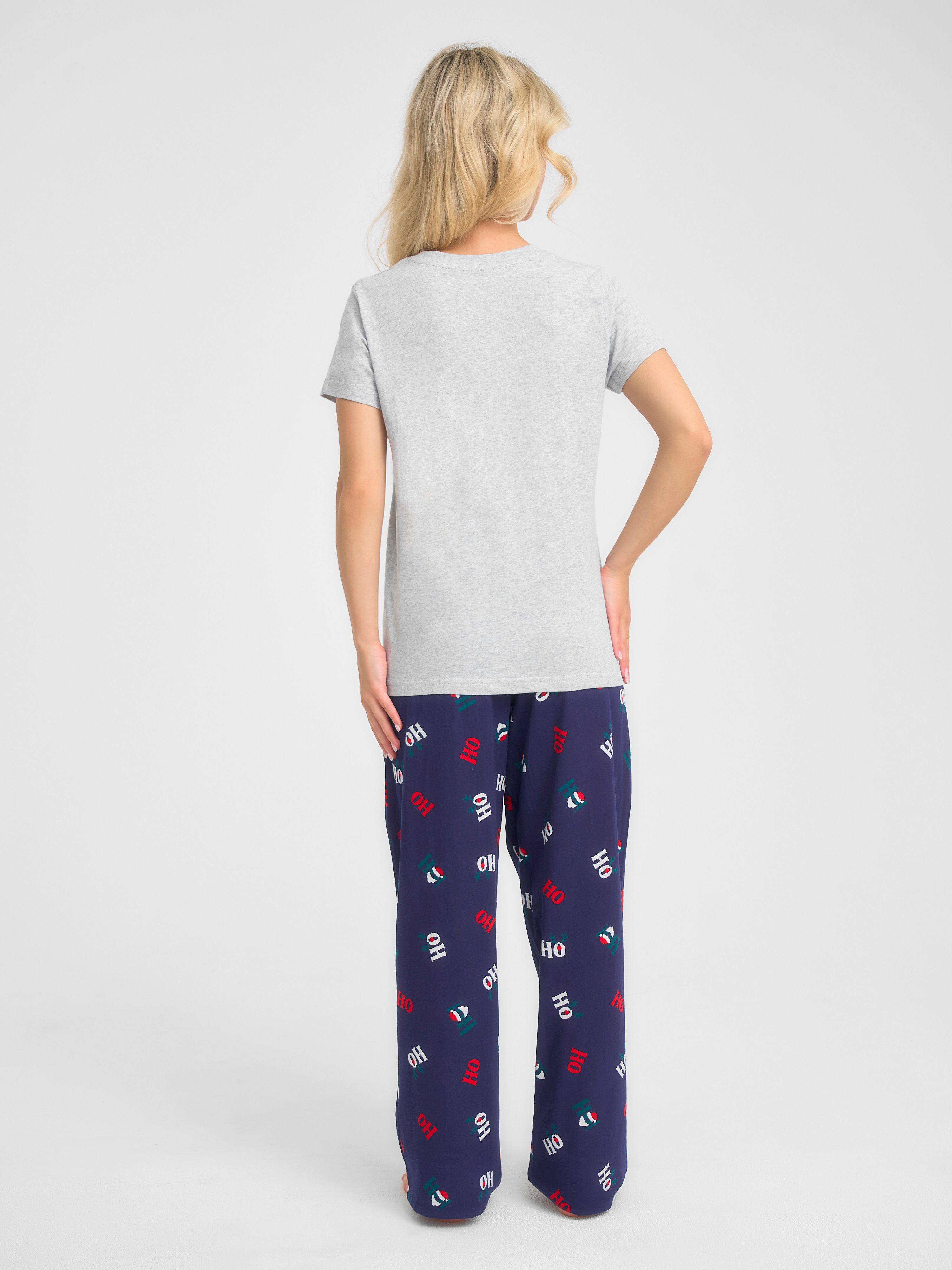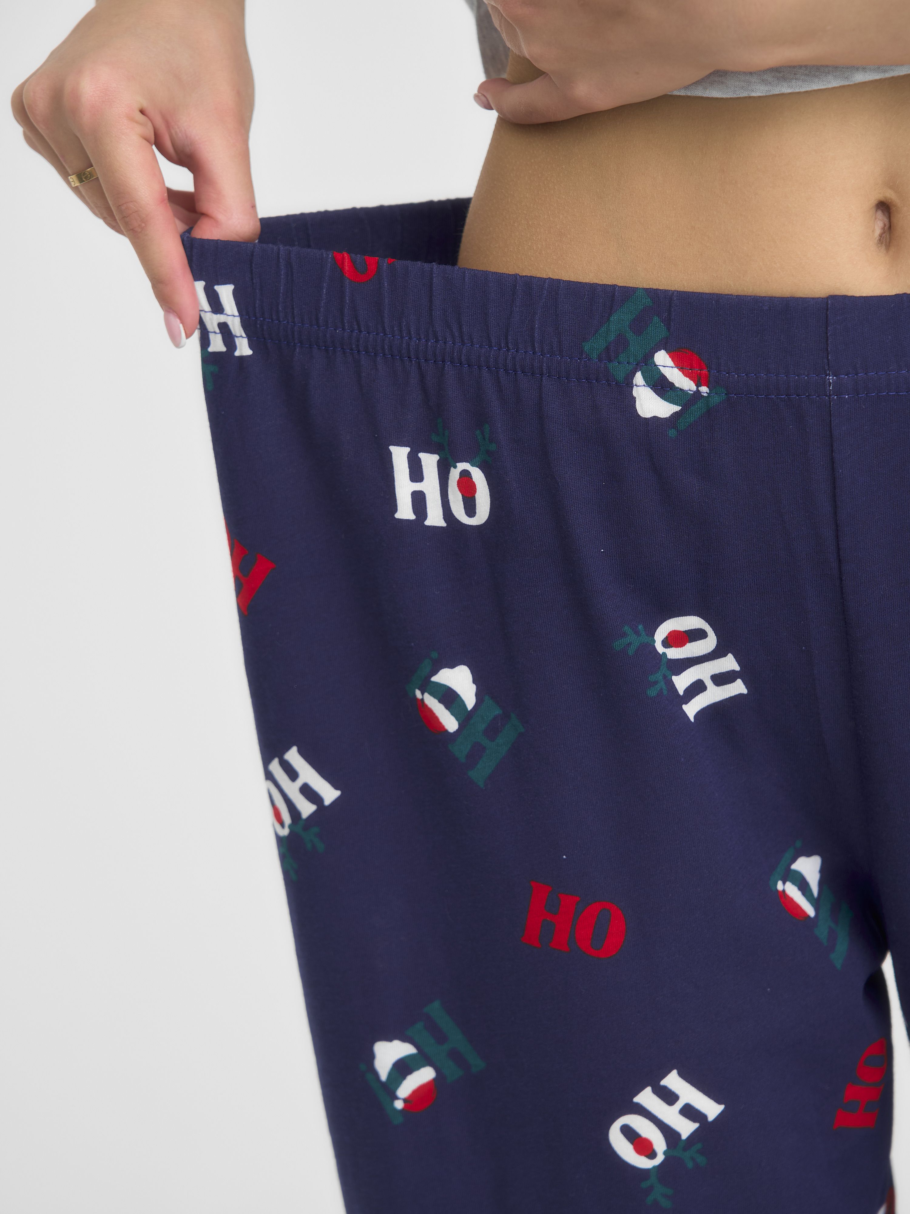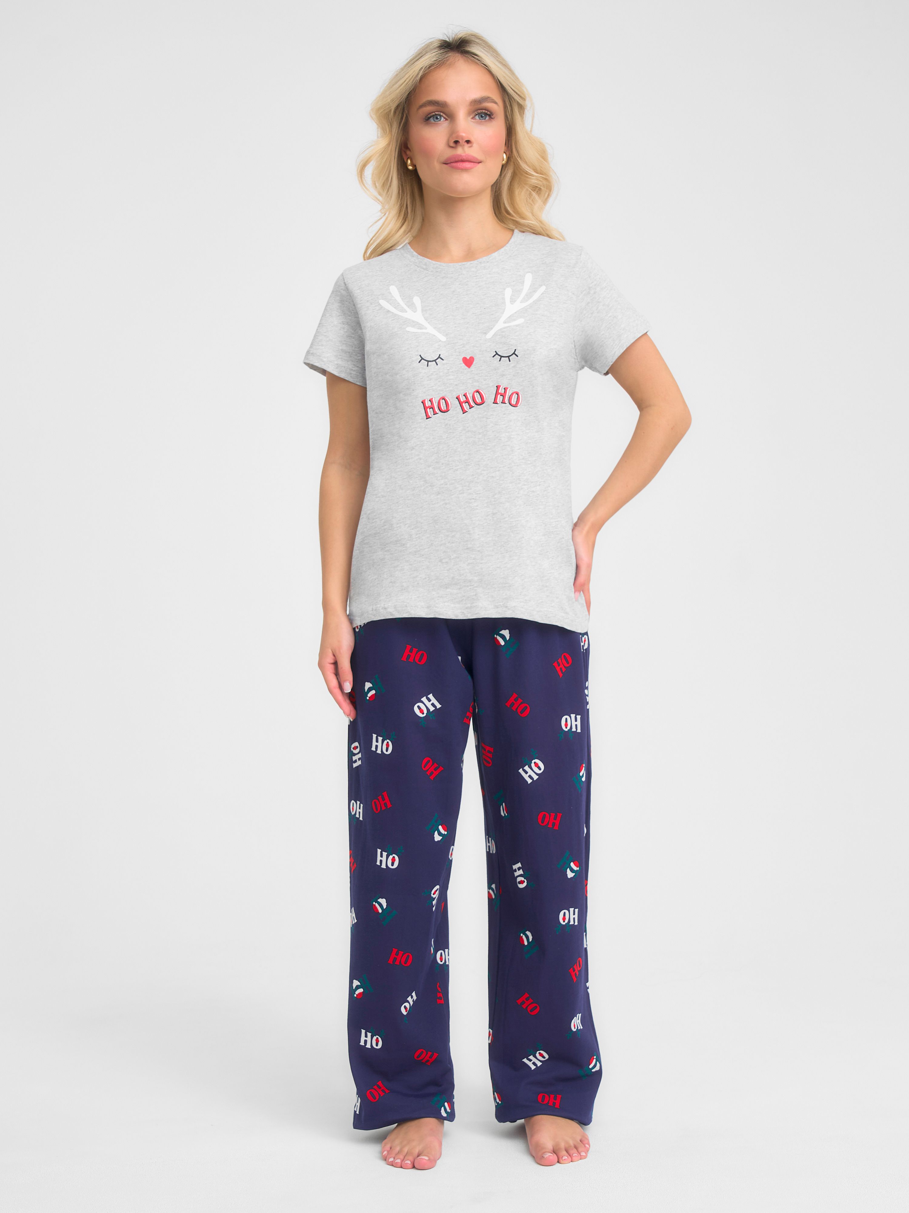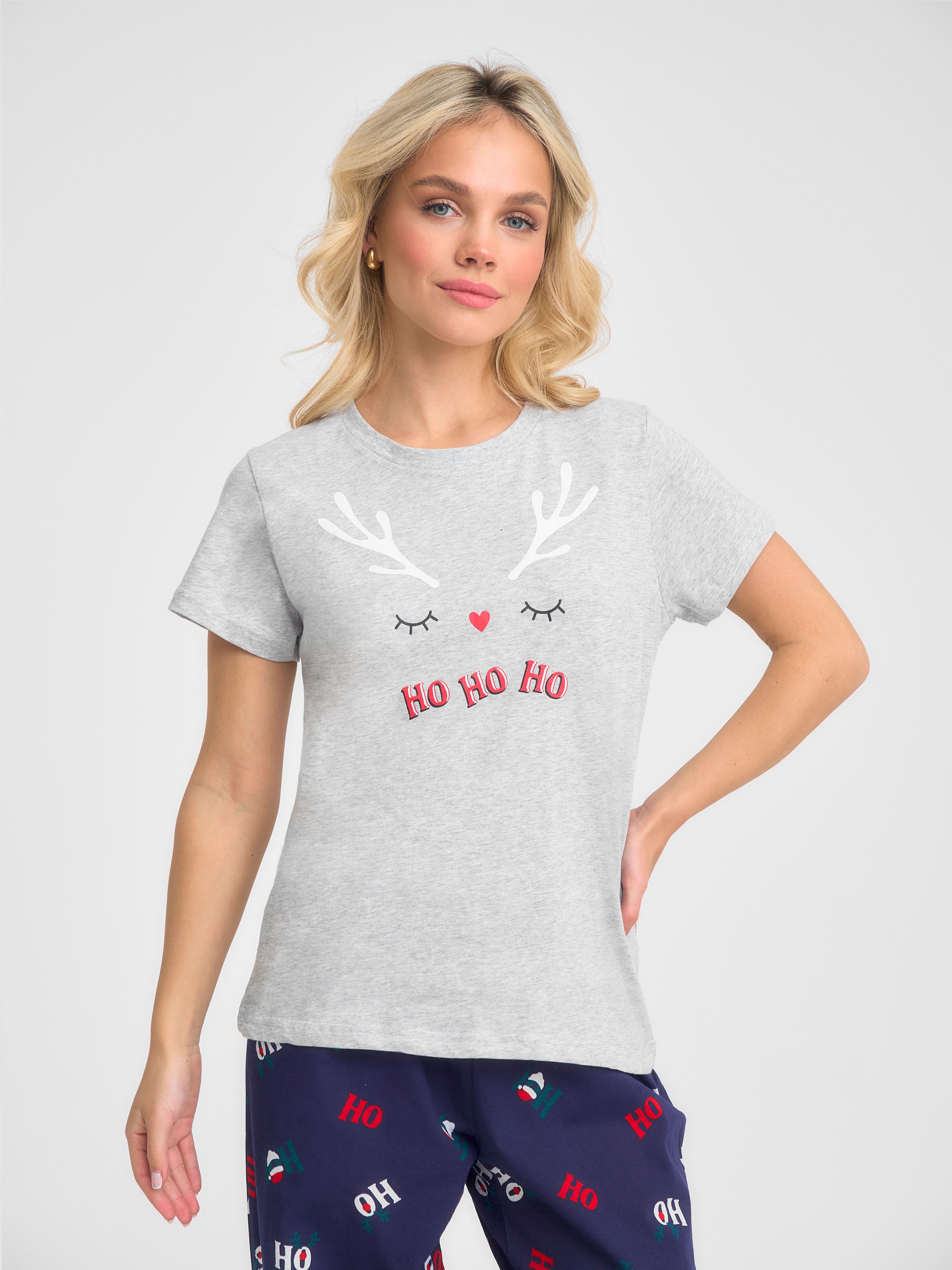 Трикотажная пижама с Новогодней тематикой. Серая футболка свободного кроя длиной до бердра украшена принтом рожки, глазки и носик оленя и надписью "Ho Ho Ho" . Брюки на резинке, свободного кроя, темно-синего цвета в белые и красные принтованые слоги "HO" .