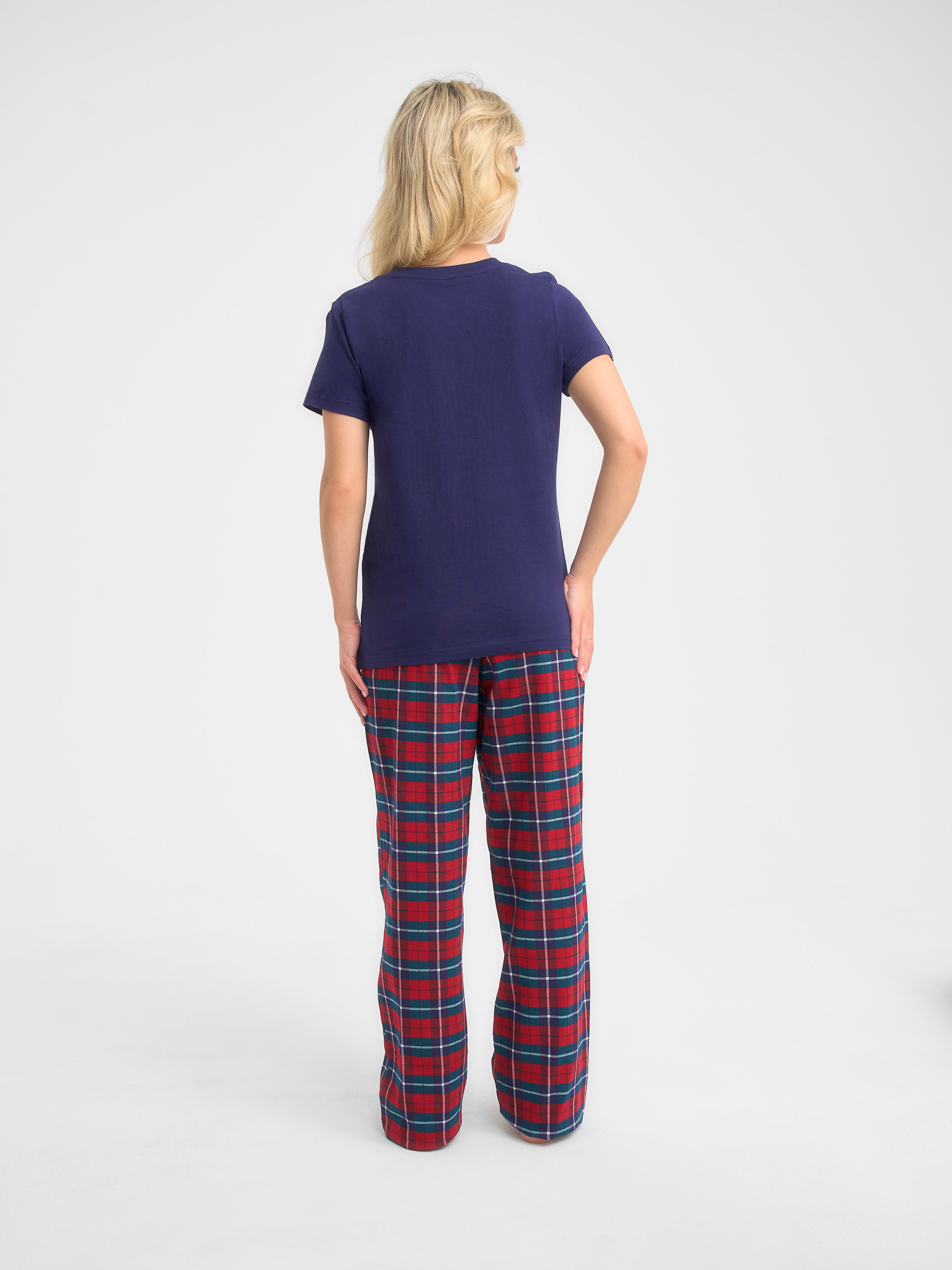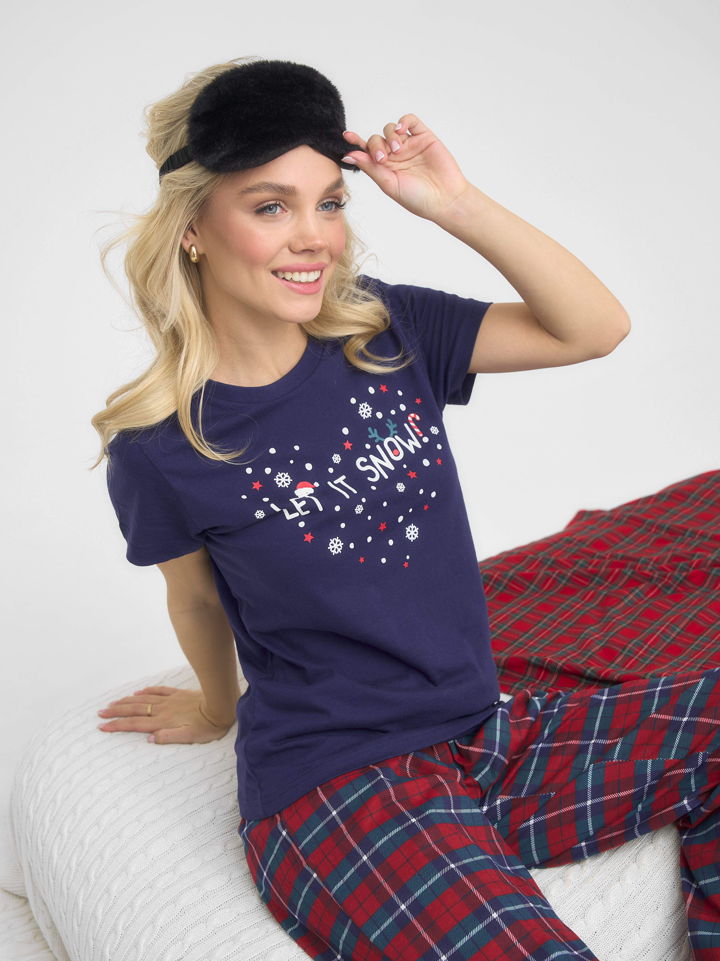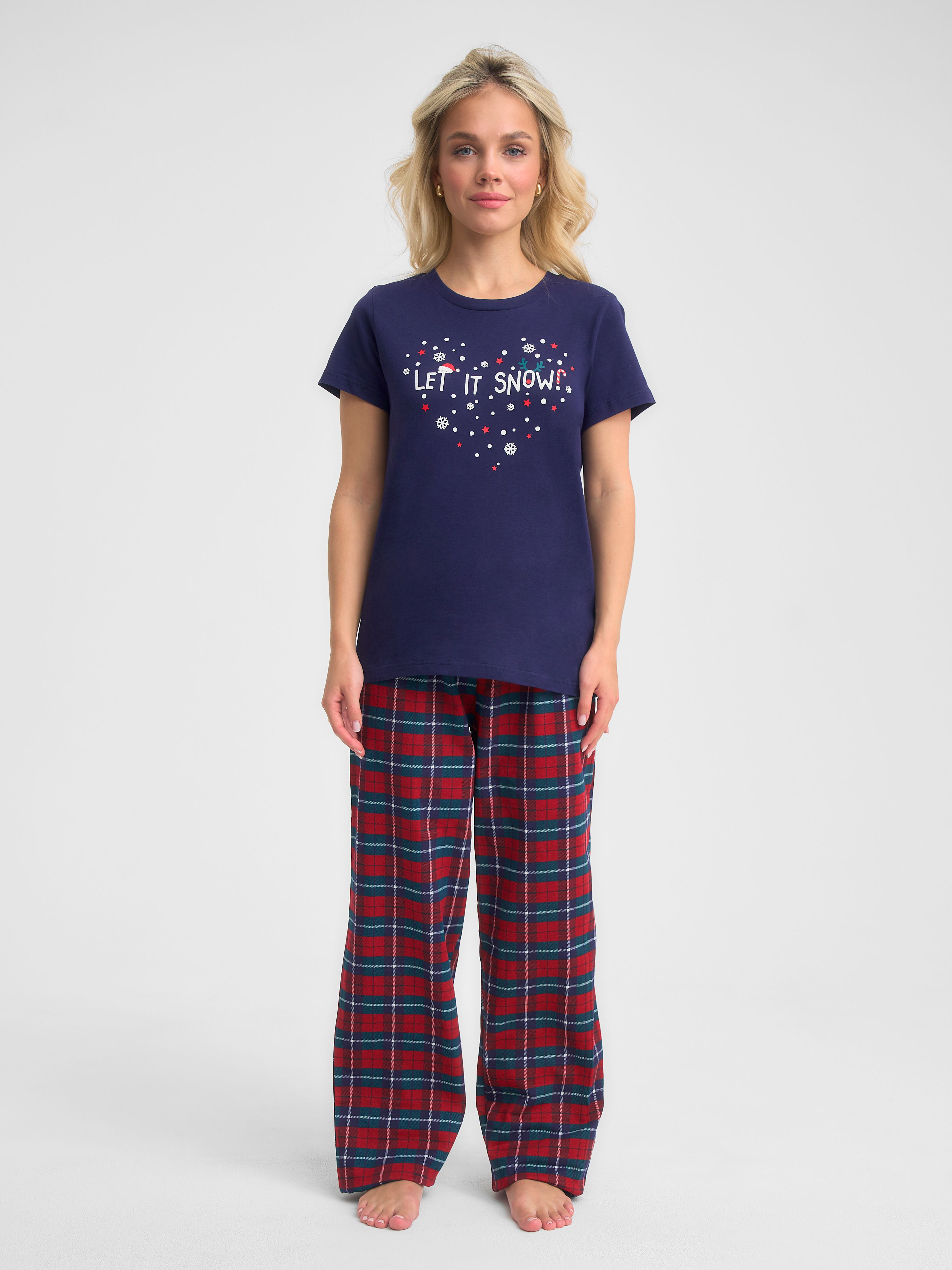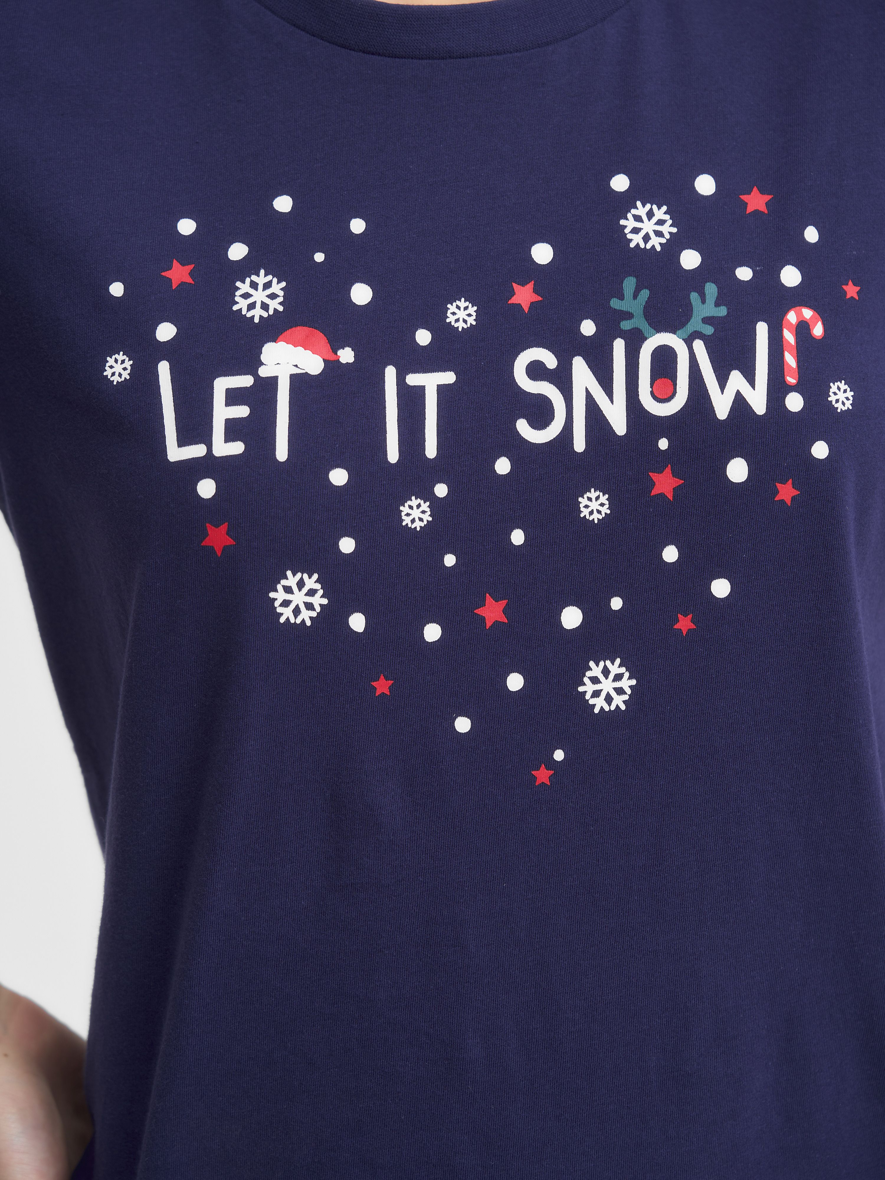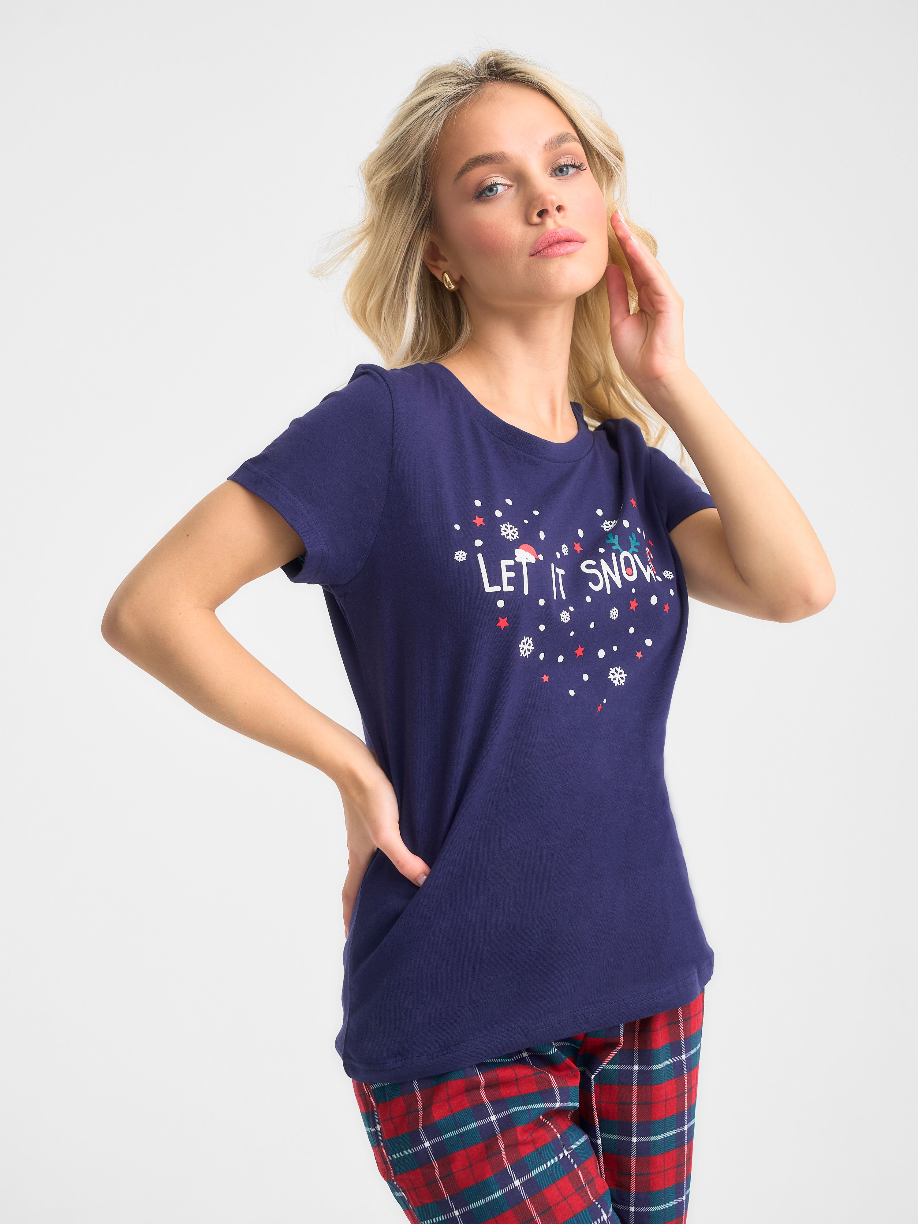 Трикотажная пижама с Новогодней тематикой. Синяя футболка свободного кроя длиной до бердра украшена принтом "сердечко из снежинок" с написью "Let it snow" Принтованные брюки свободного кроя на резинке.