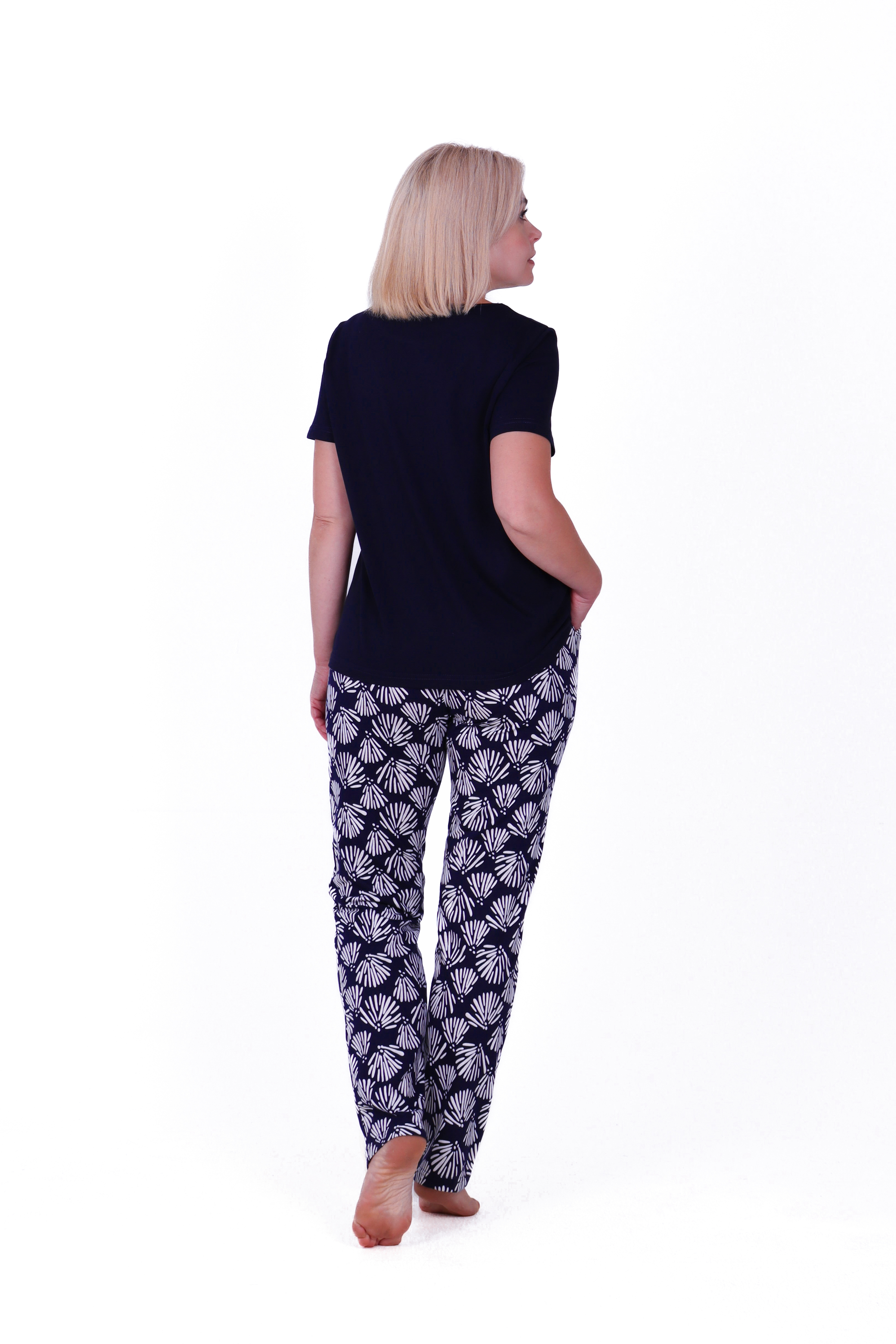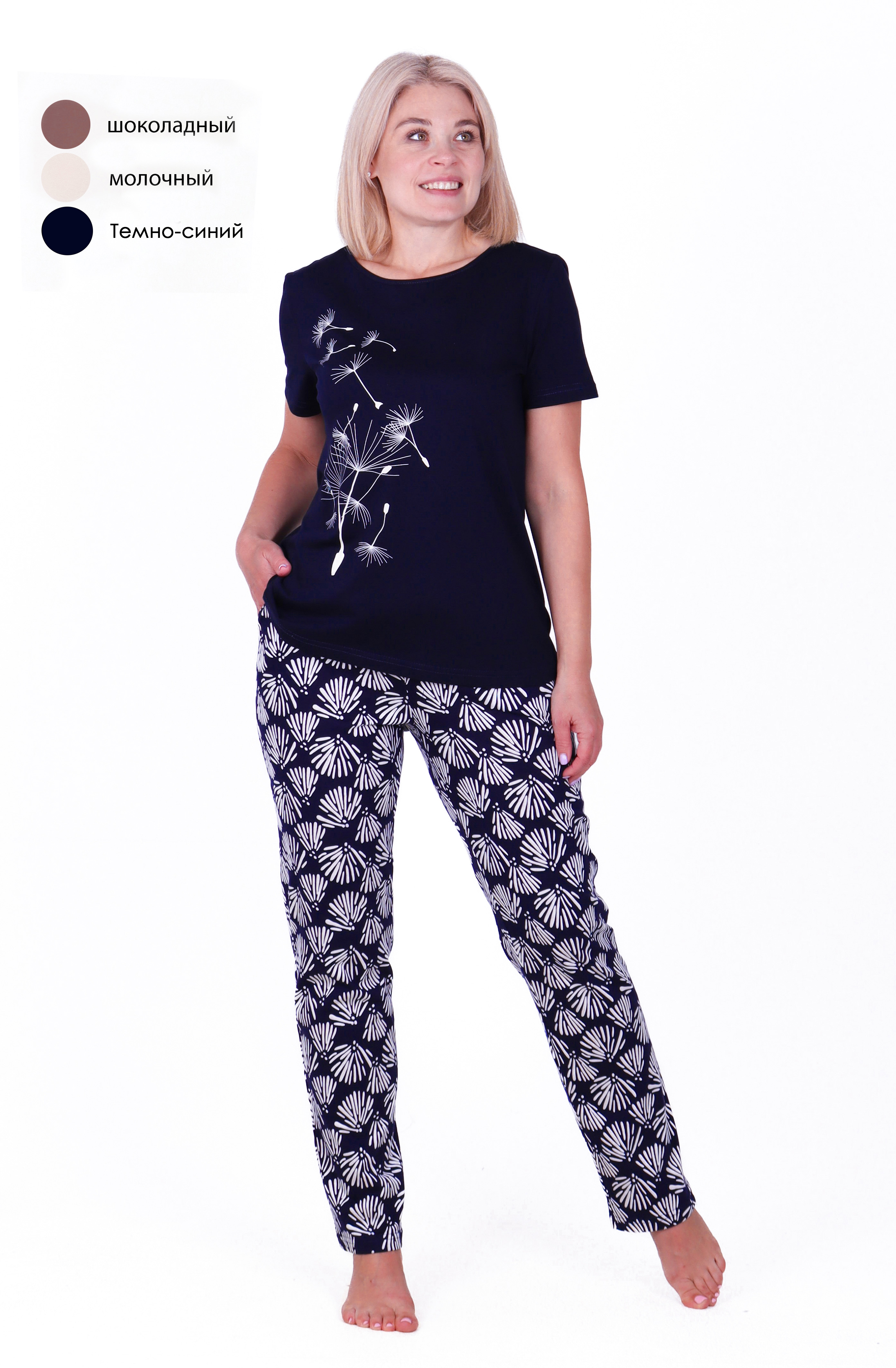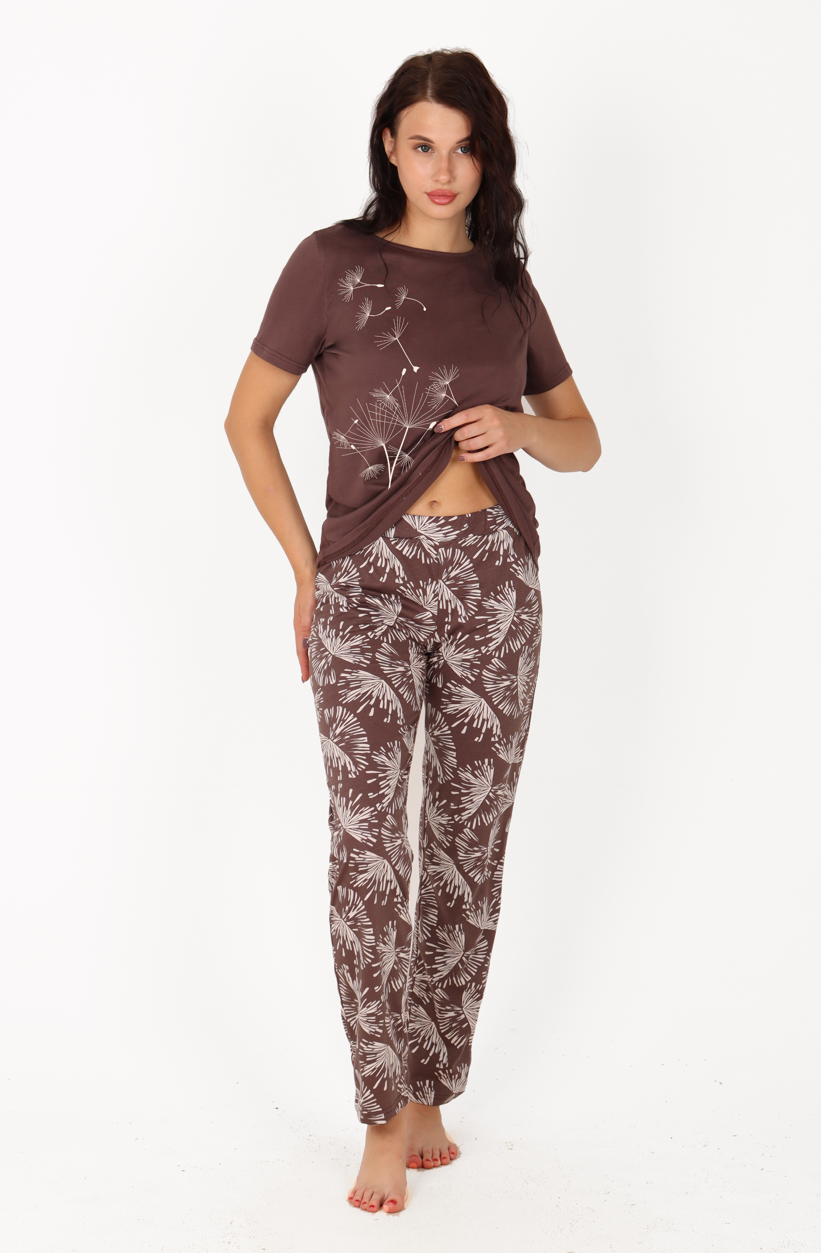 Женская пижама для дома, сна и отдыха. Пижама свободного кроя из 100% хлопка с монохромным растительным принтом. Комплект включает в себя футболку с удлиненным рукавом и брюки с поясом на резинке. Благодаря высокому качеству материалов, как ткань,так и принт не потеряют своей яркости даже после многократных стирок.