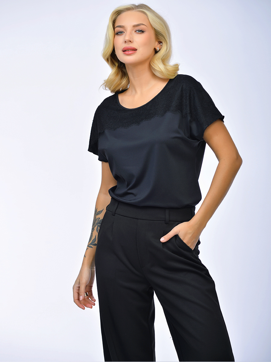 Элегантная женская блузка из плотного струящегося полиамидного трикотажа со спущенной линией плеча украшена кружевом «ресничка». По низу рукавов и по нижнему краю изделия выполнена закрутка, которая подчеркивает плавные линии силуэта. Кружевная