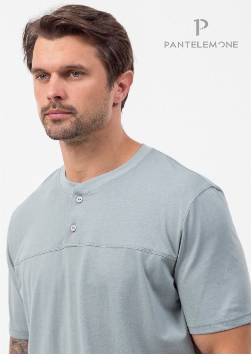 Футболка среднего объёма, с застежкой на пуговицах. На передней детали кокетка. Выполнена из гладкокрашенного полотна.