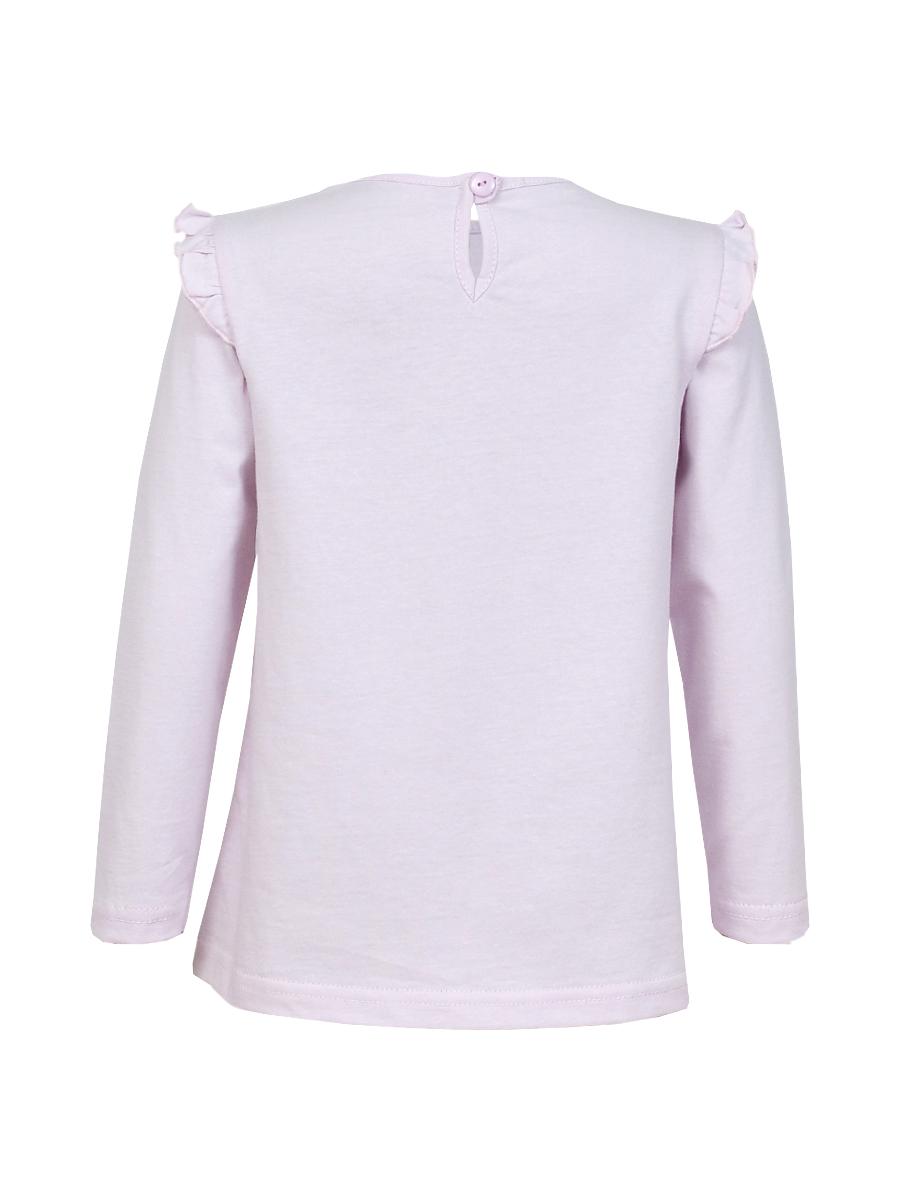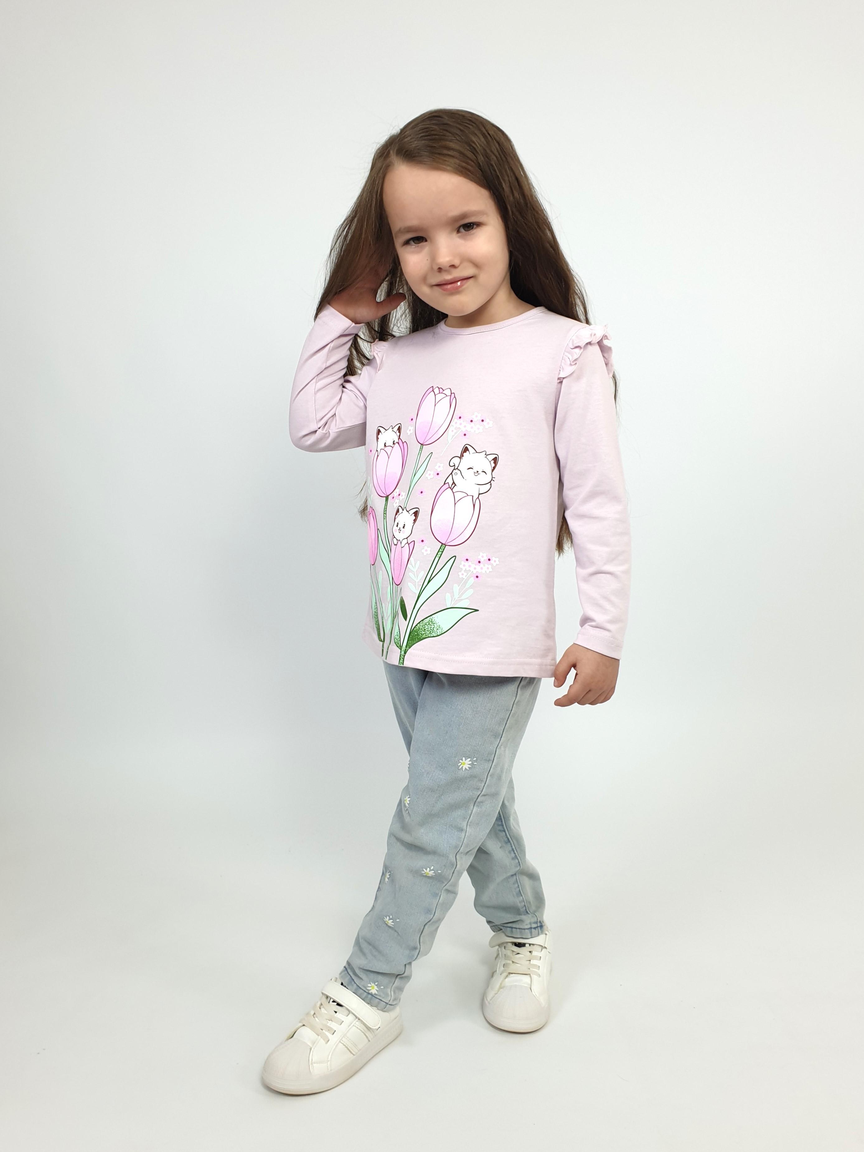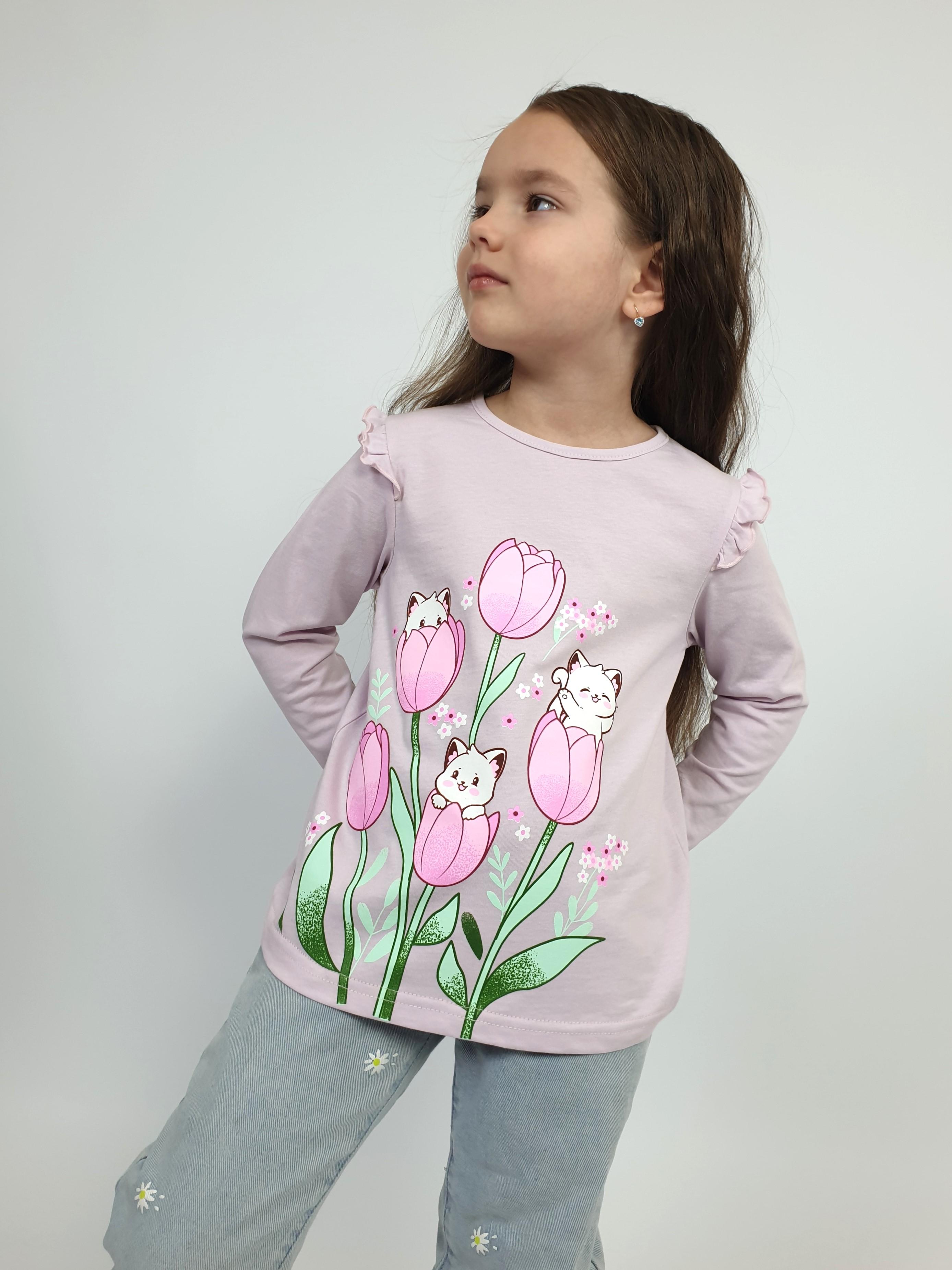 Джемпер-силуэт трапеция, длинный втачной рукав, в пройме рюша. Горловина окантована, застежка на пуговицу по спинке. Печать на переде.