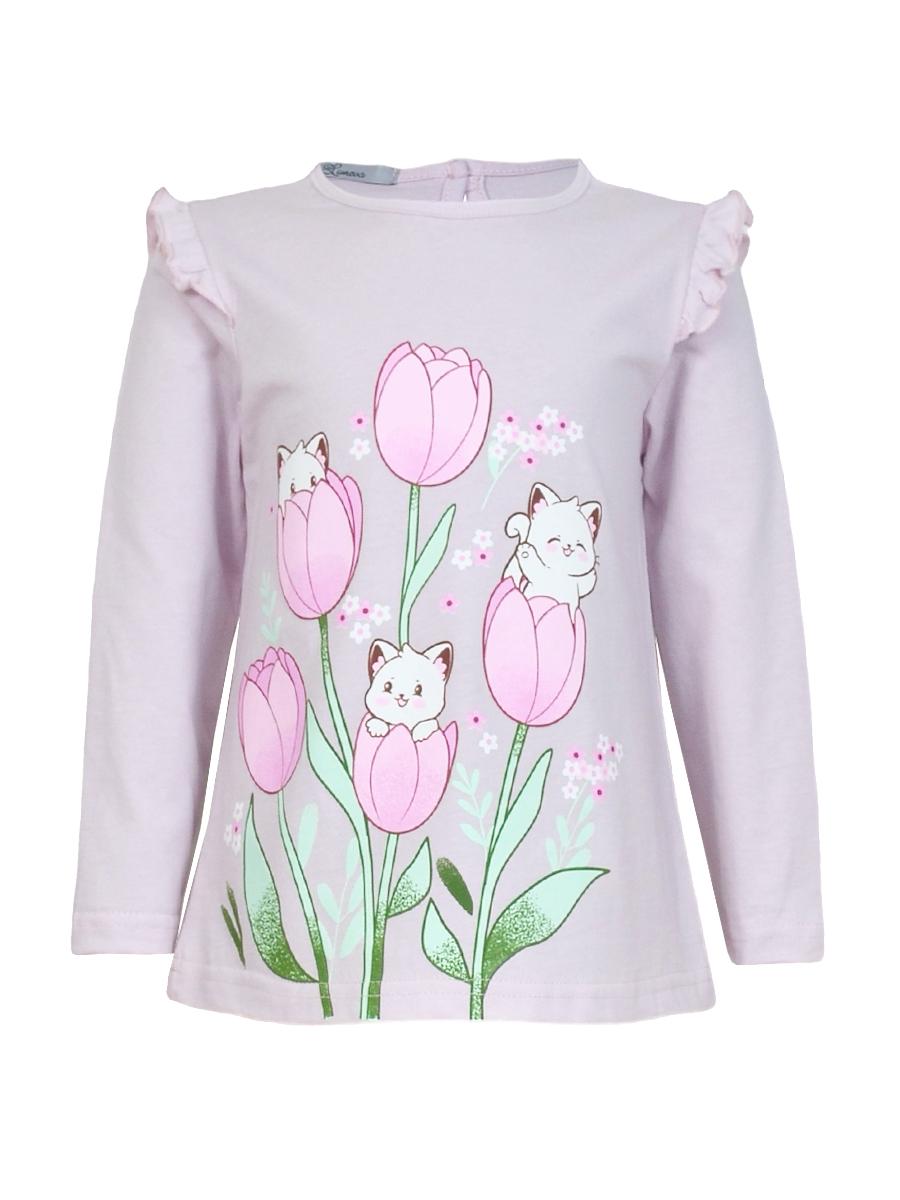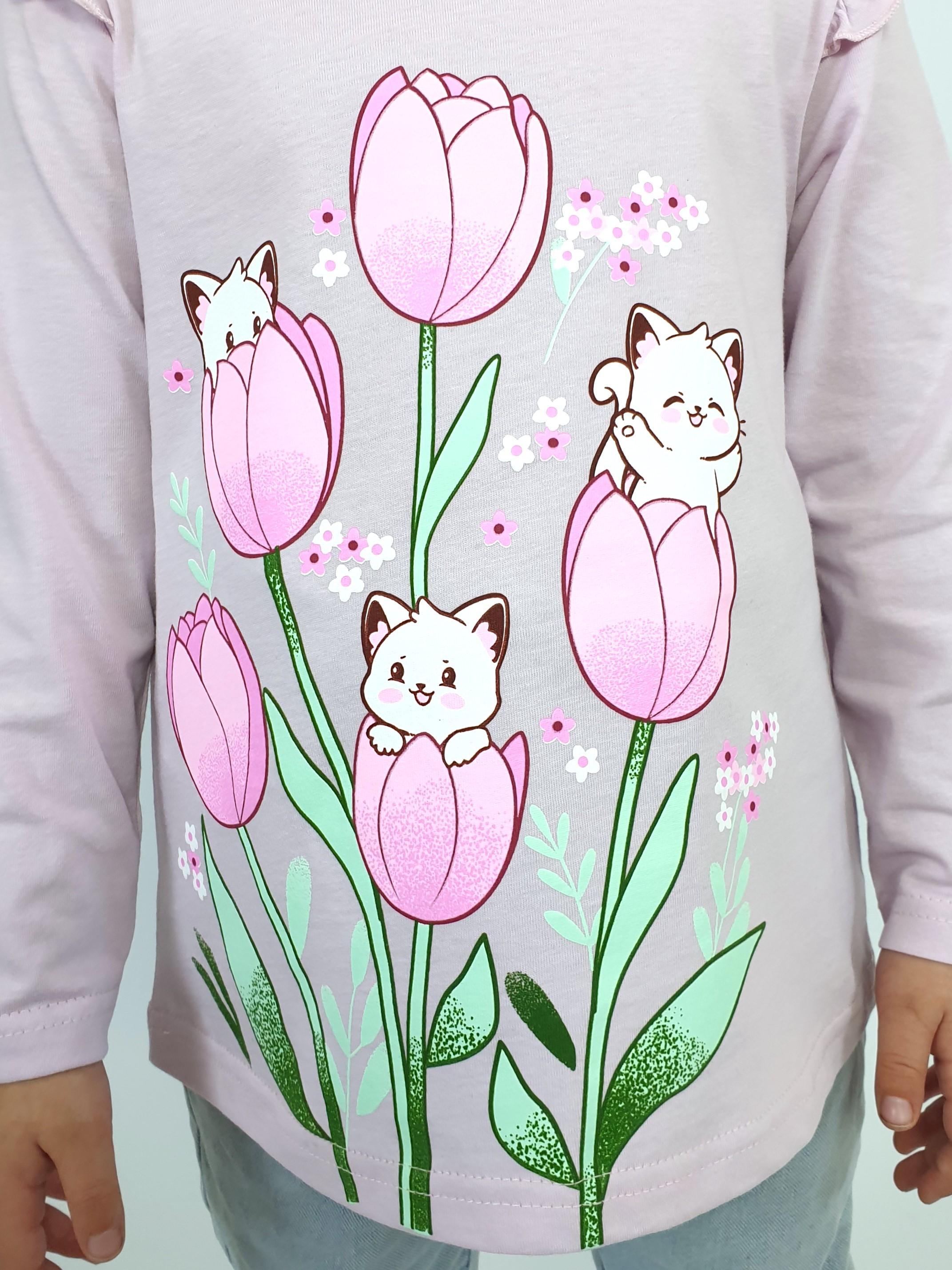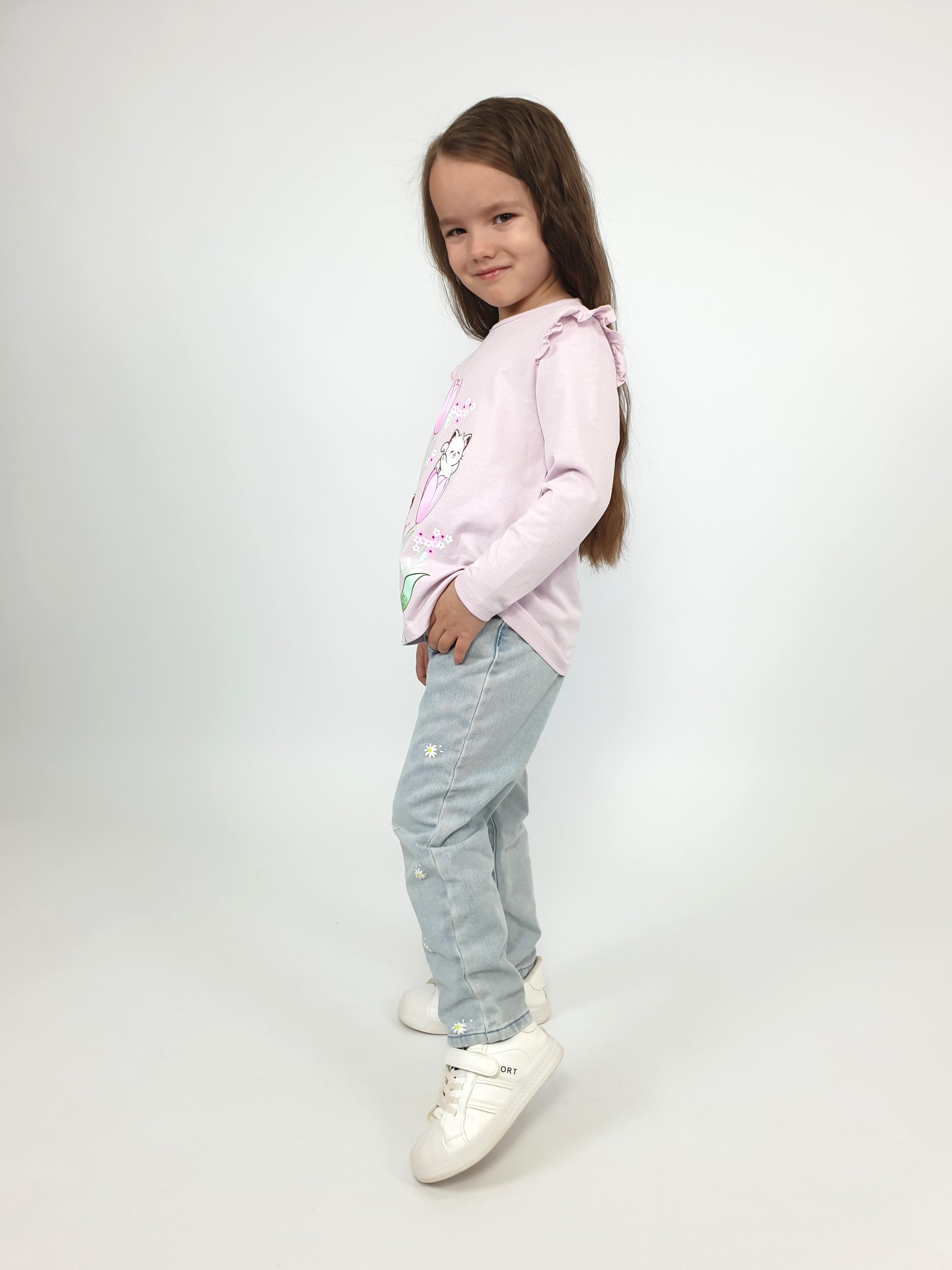 Джемпер-силуэт трапеция, длинный втачной рукав, в пройме рюша. Горловина окантована, застежка на пуговицу по спинке. Печать на переде.