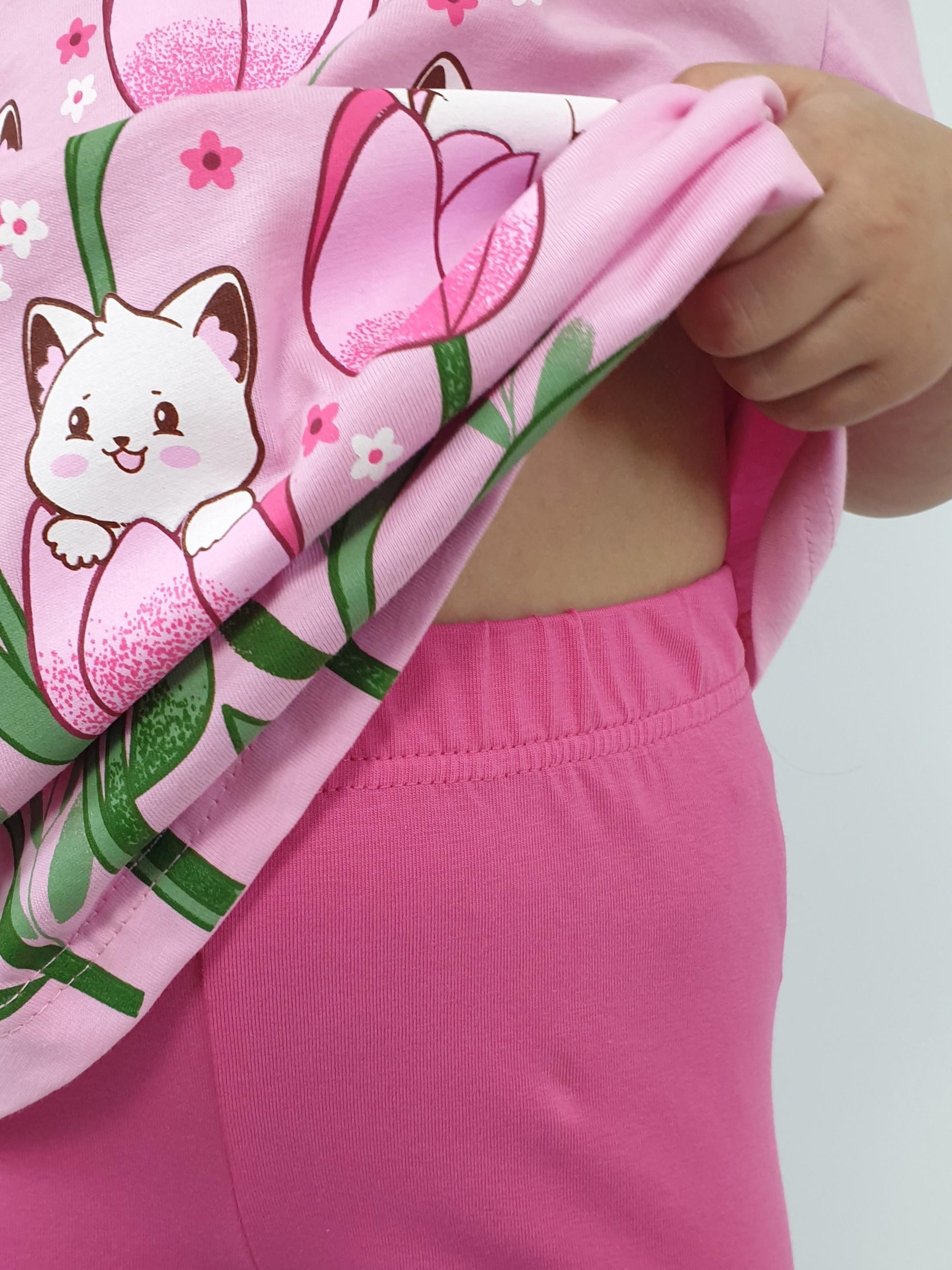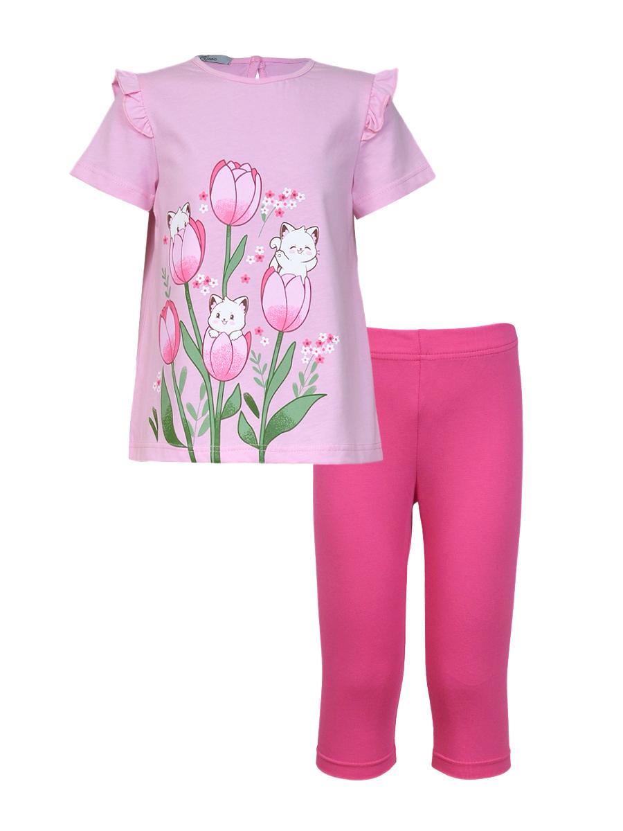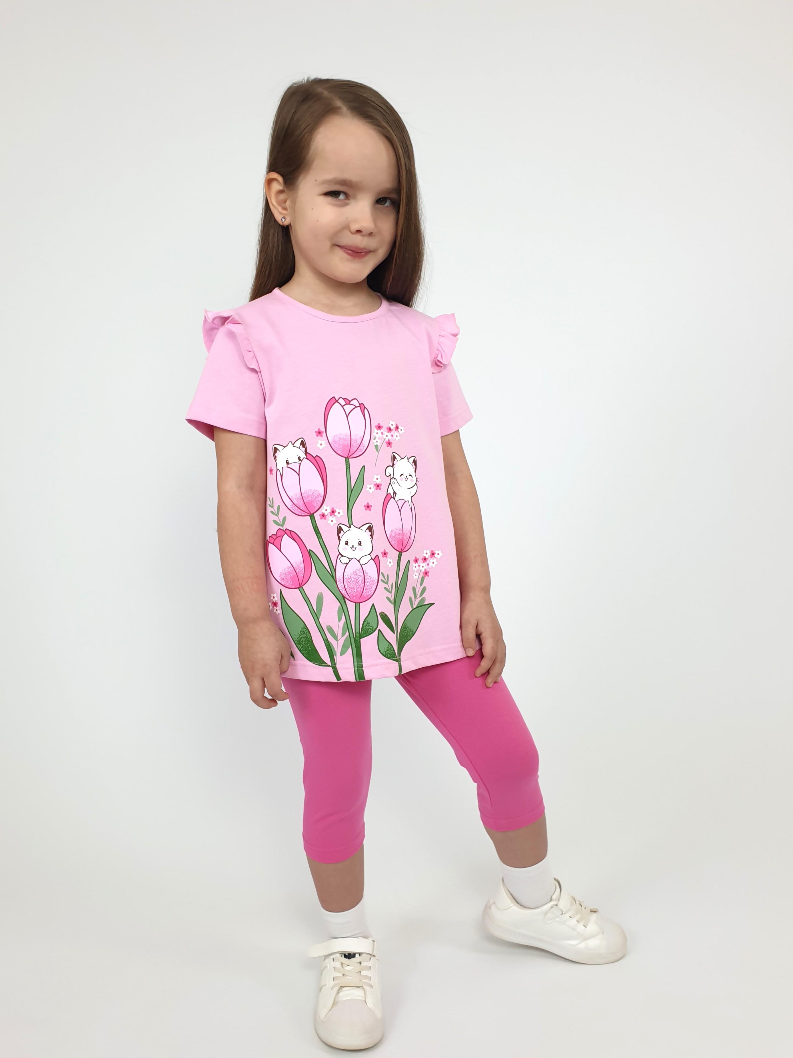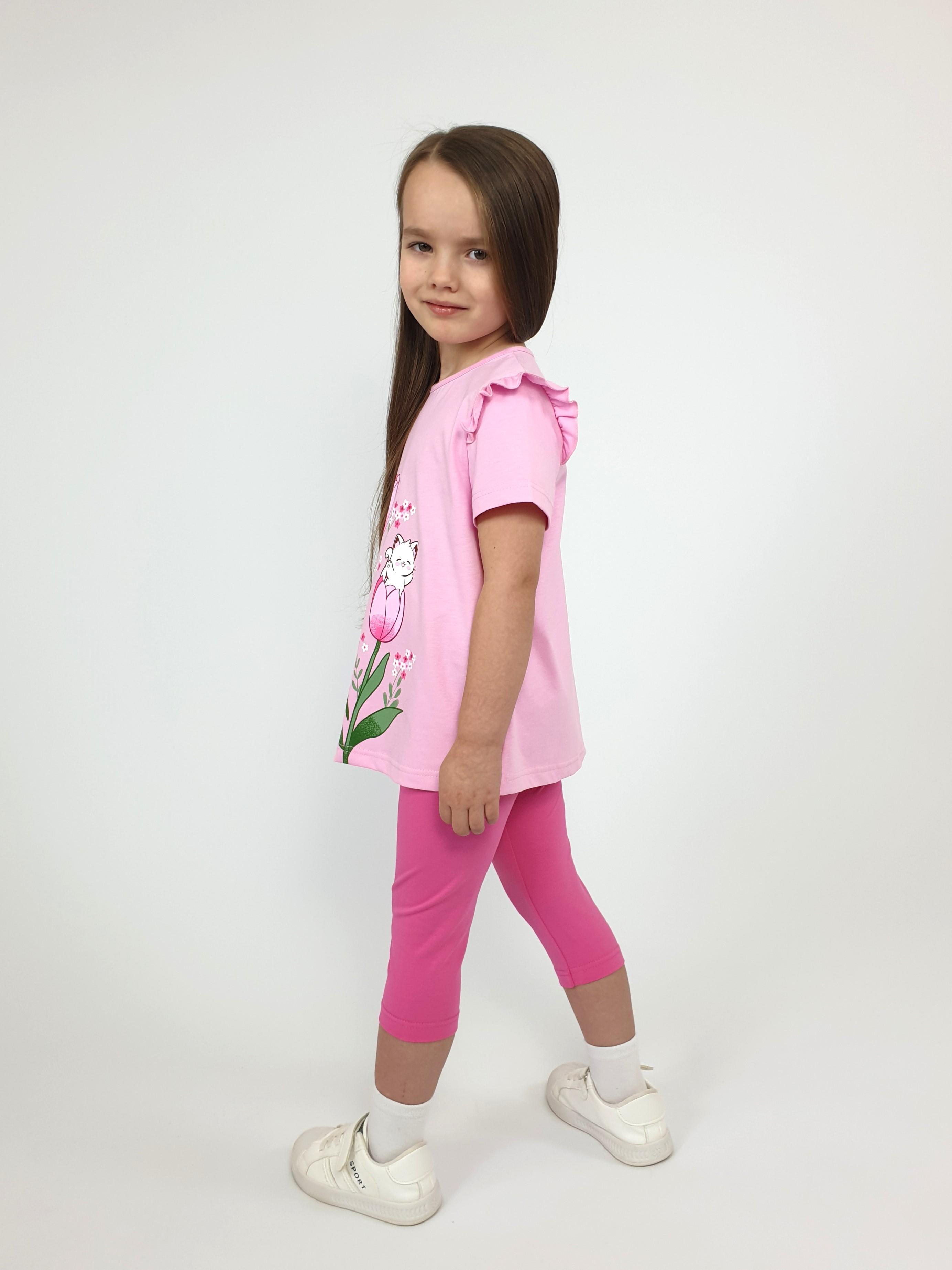 Джемпер-силуэт трапеция, короткий втачной рукав, в пройме рюша. Горловина окантована, застежка на пуговицу по спинке. Печать на переде. Лосины-укороченные вверху на резинке.