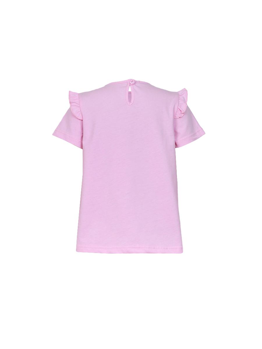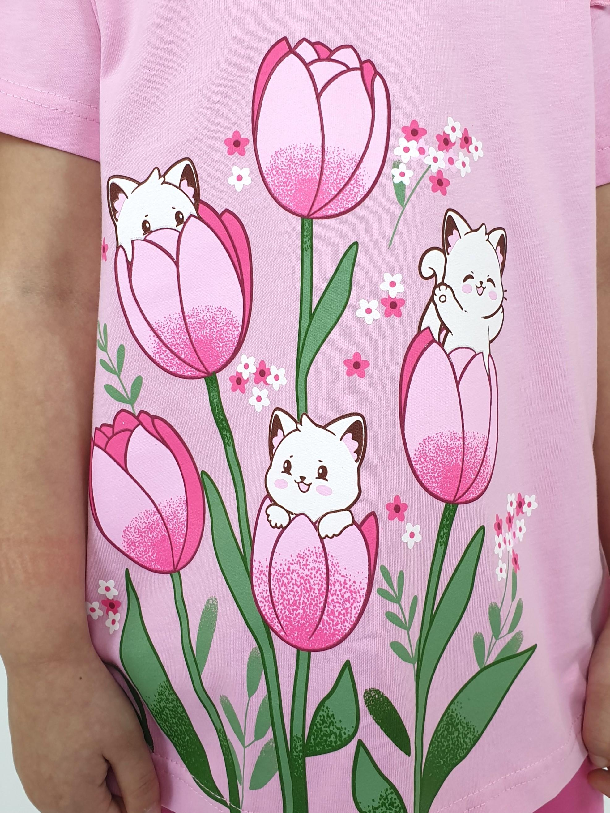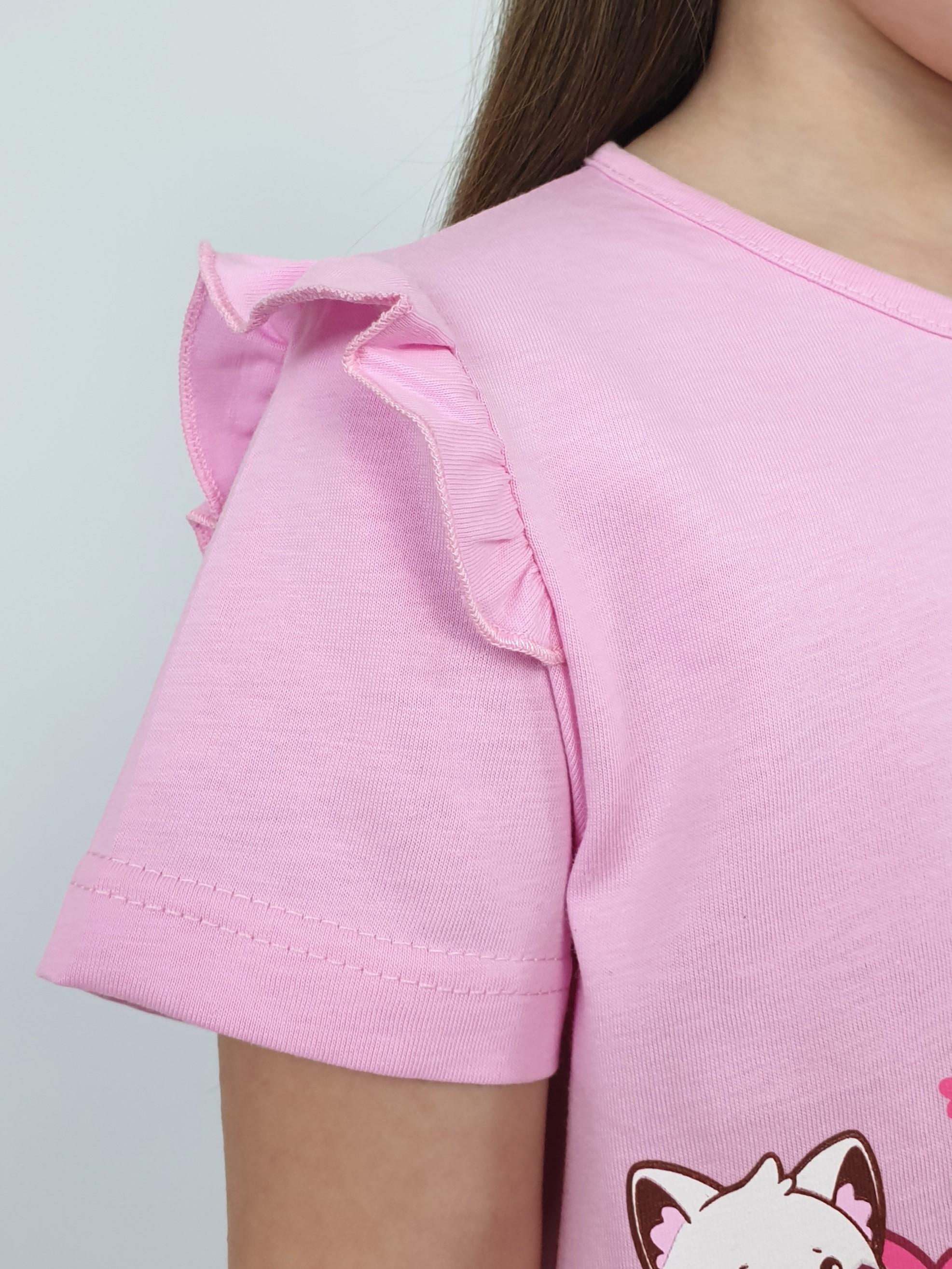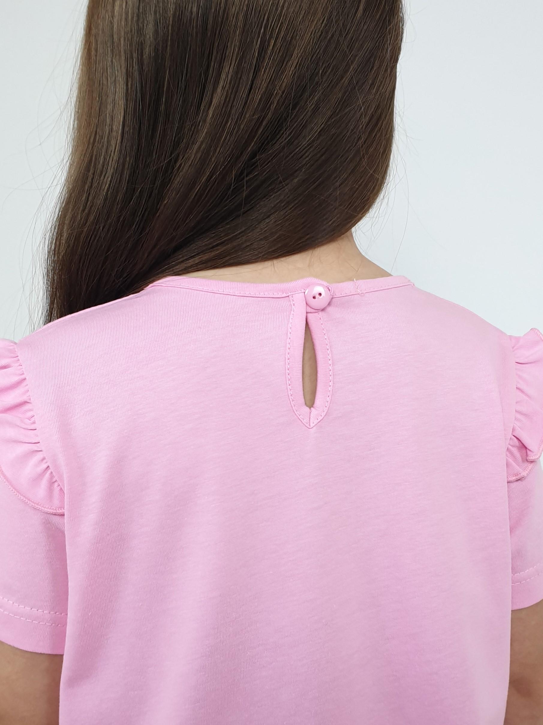 Джемпер-силуэт трапеция, короткий втачной рукав, в пройме рюша. Горловина окантована, застежка на пуговицу по спинке. Печать на переде. Лосины-укороченные вверху на резинке.