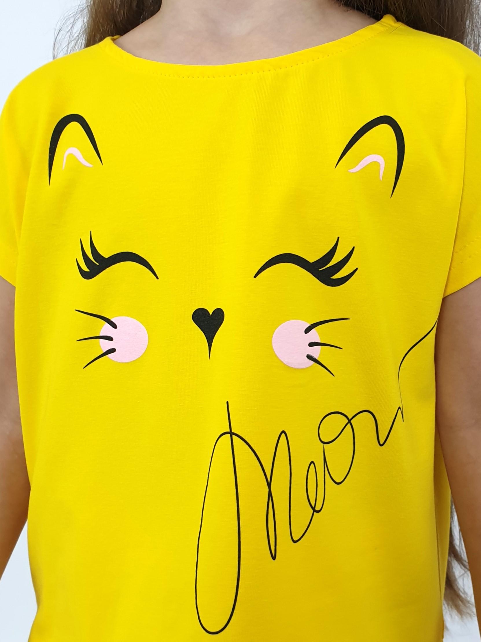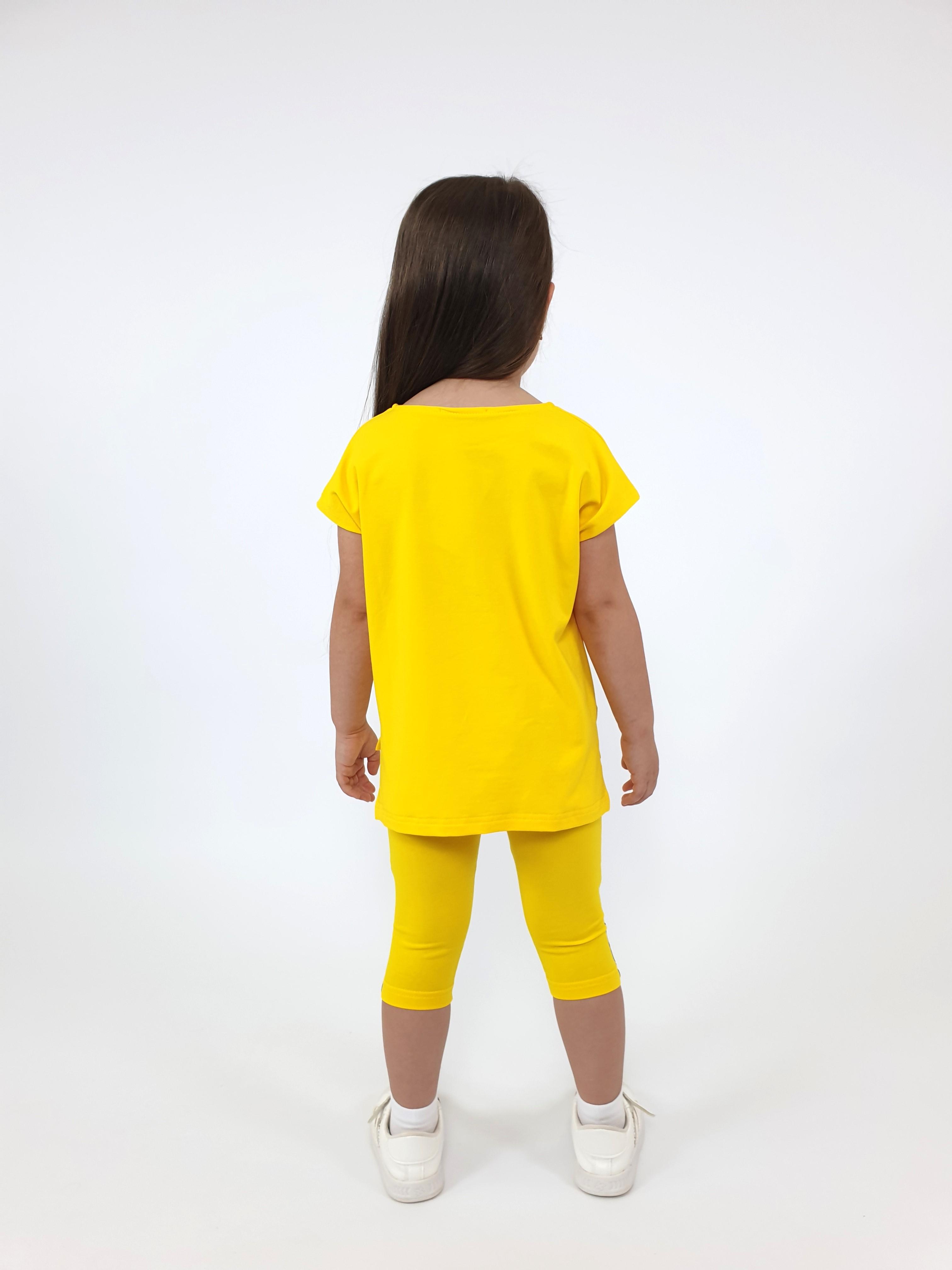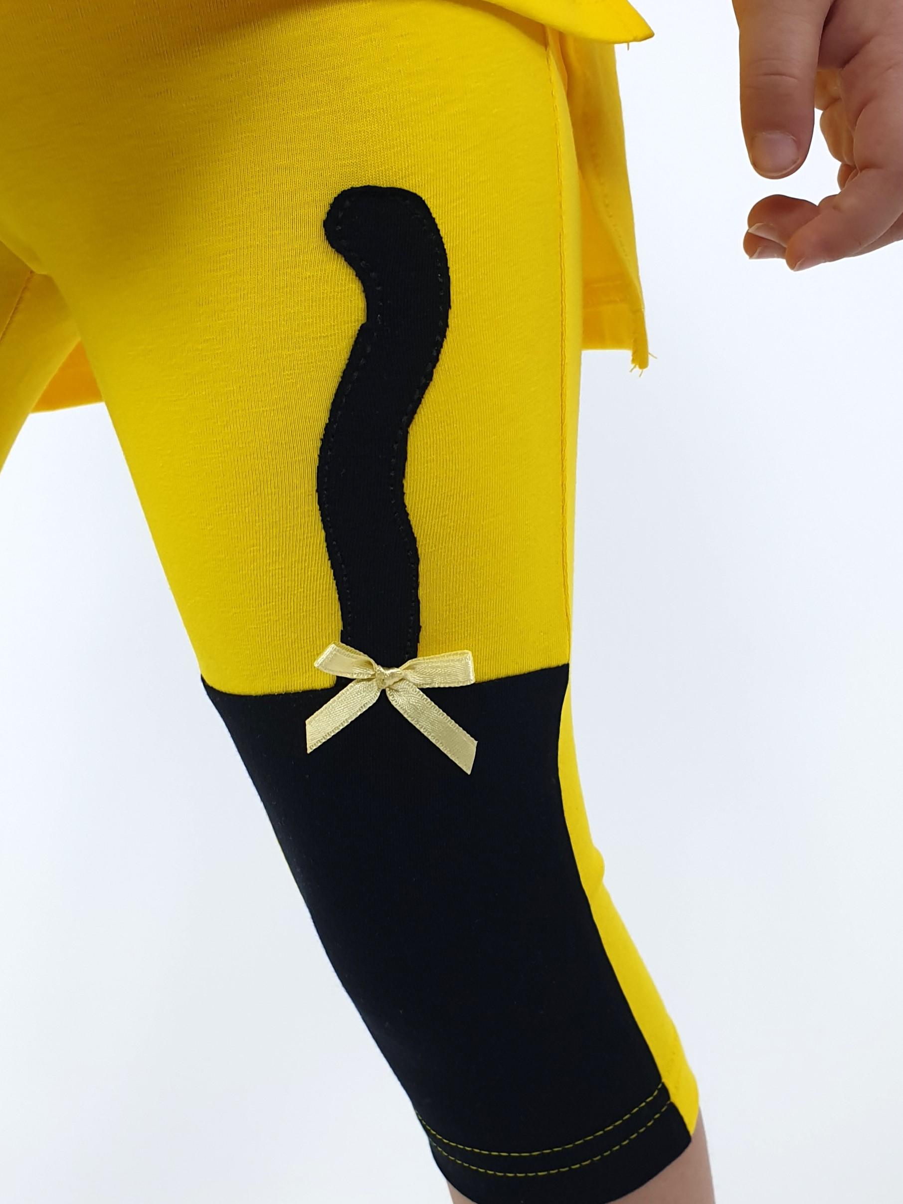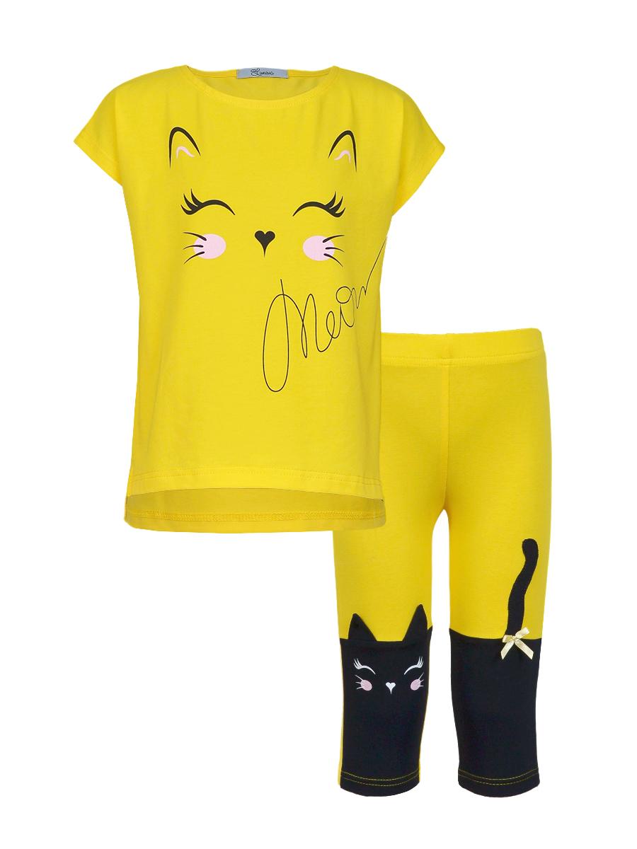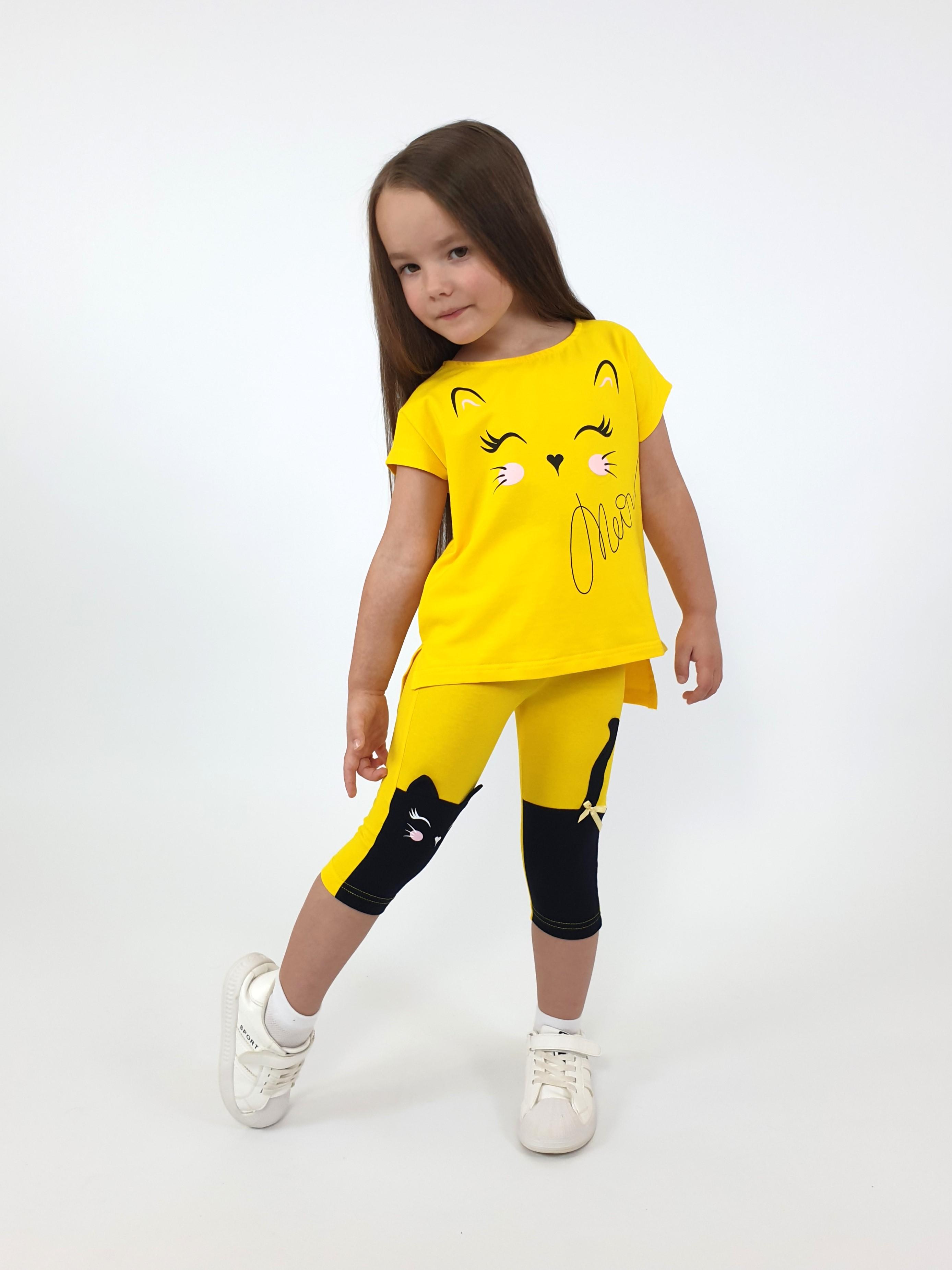 Фуфайка-прямой силуэт, удлиненная спинка с разрезами, перед с печатью. Спущенное плечо, горловина окантована и подшита. Лосины-укороченные, передние половинки с подрезами. Вышивка-аппликация слева, печать на правой передней стороне. Отделочный бантик.