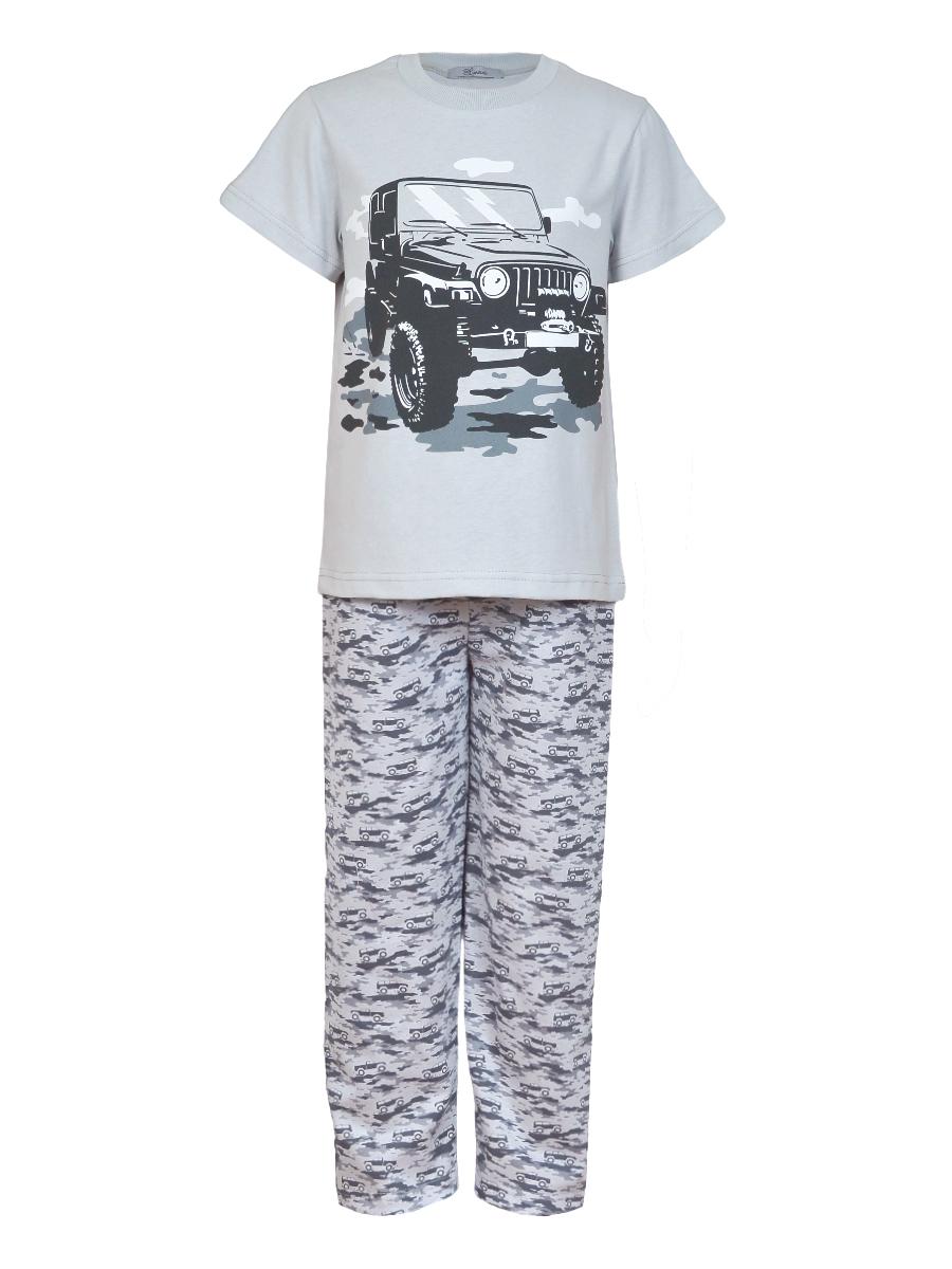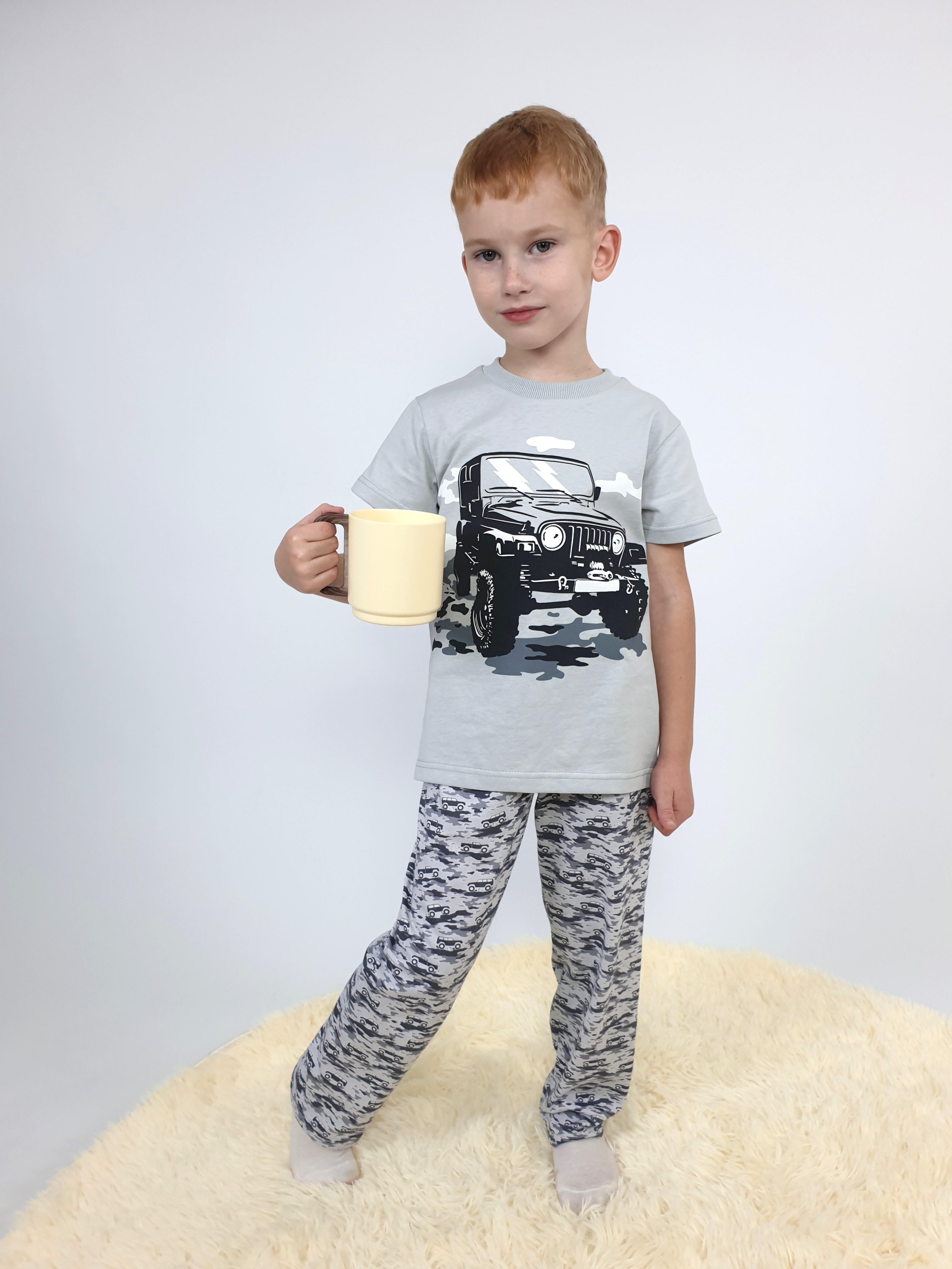 Фуфайка (пижамная)-прямая, рукав втачной, короткий. Горловина обработана ластиком. Печать на переде. Брюки (пижамные)-длинные, прямые. Верхний срез подшит с резинкой.