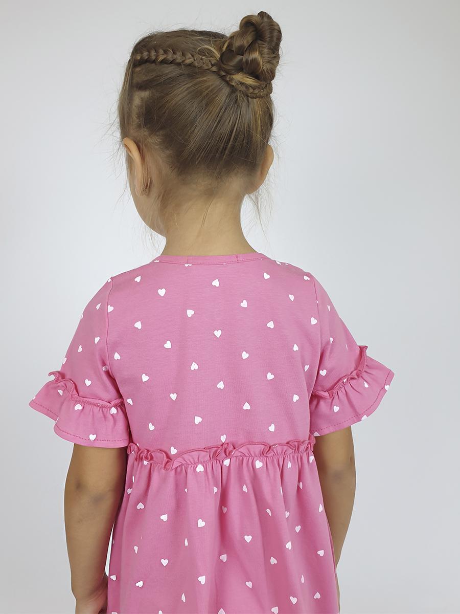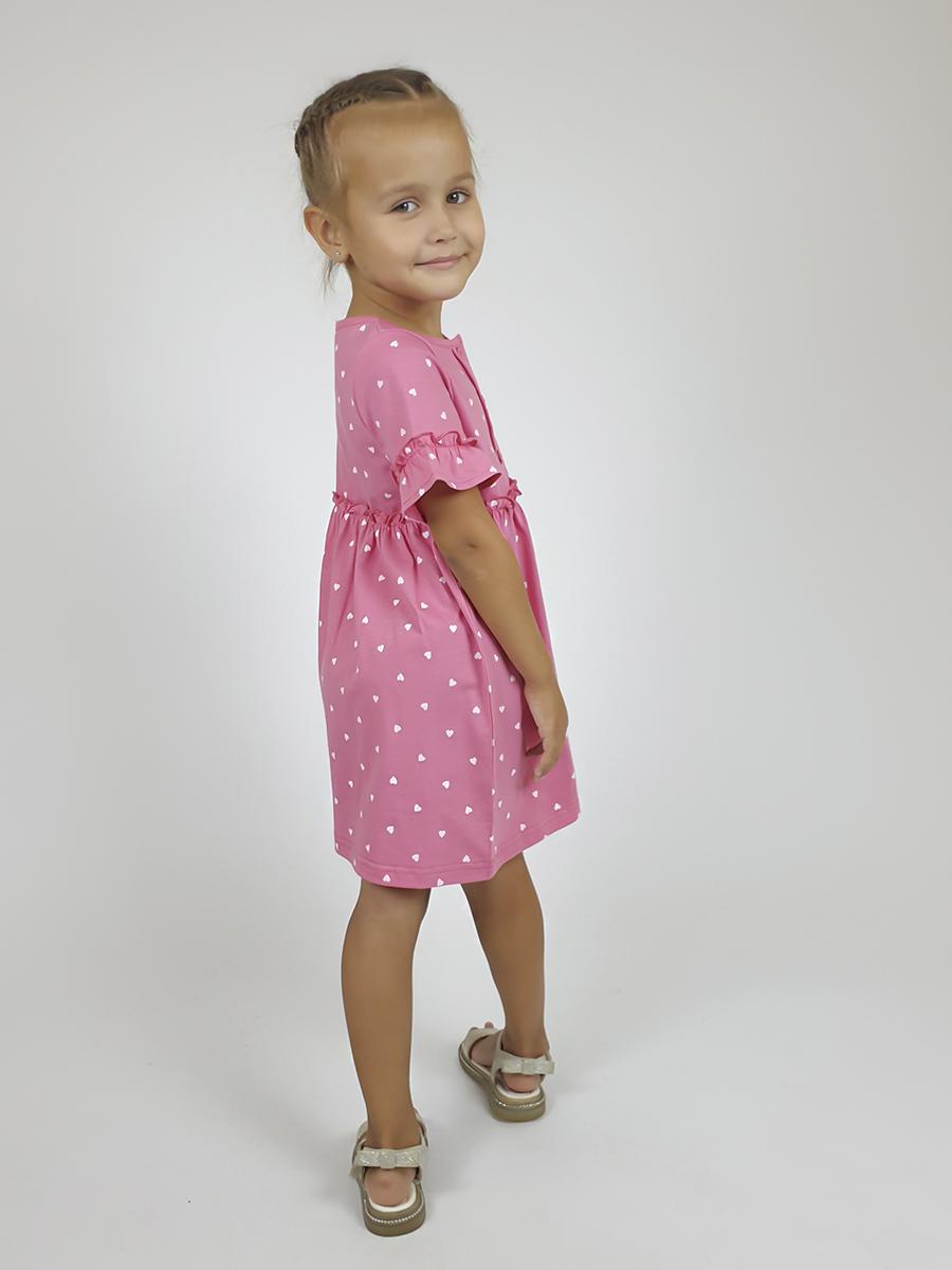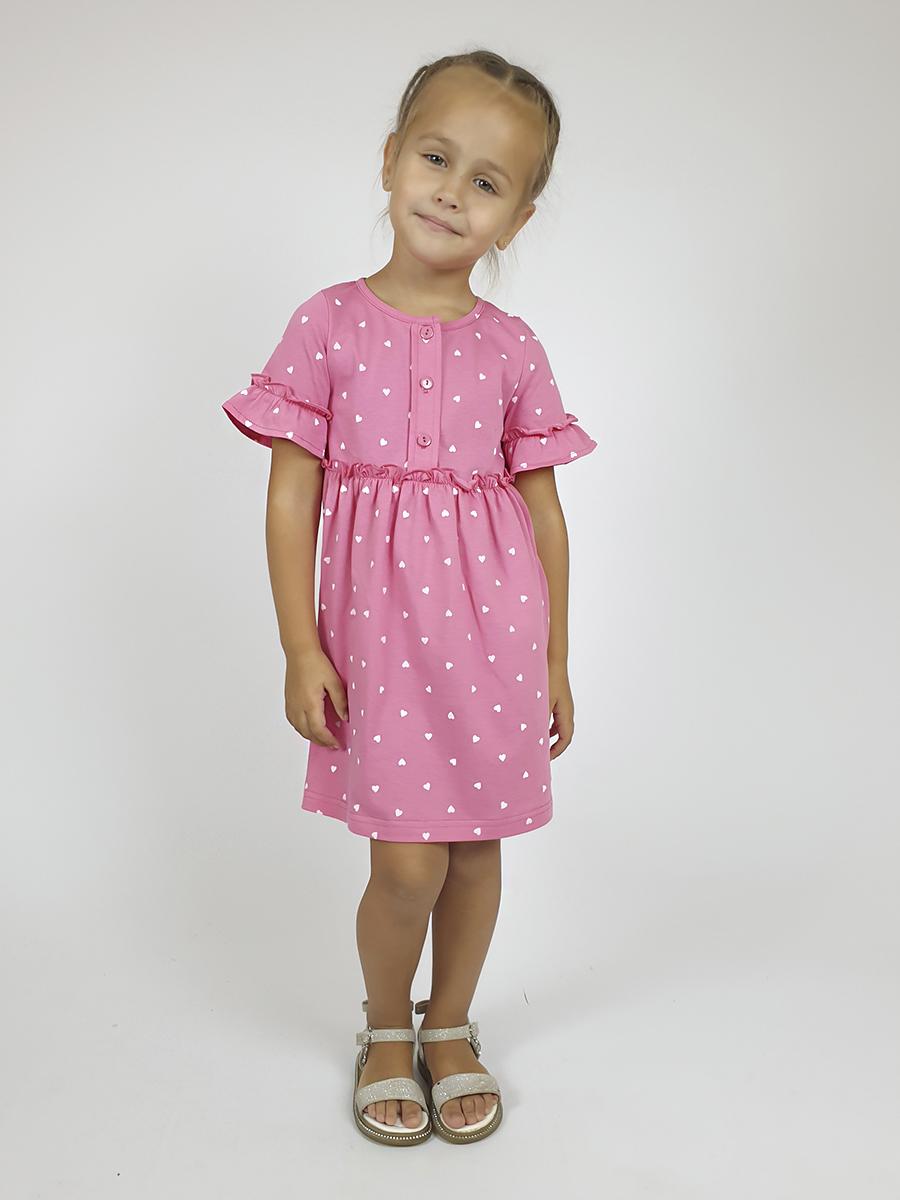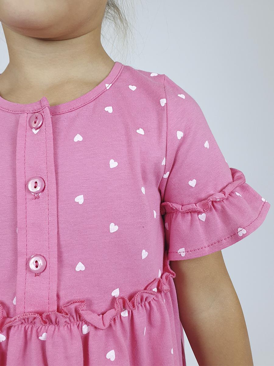 Платье-силуэт трапеция, перед и спинка с кокеткой, юбка со сборкой. Рукав короткий с рюшей. Застежка по переду, на пуговицы. Горловина окантована.