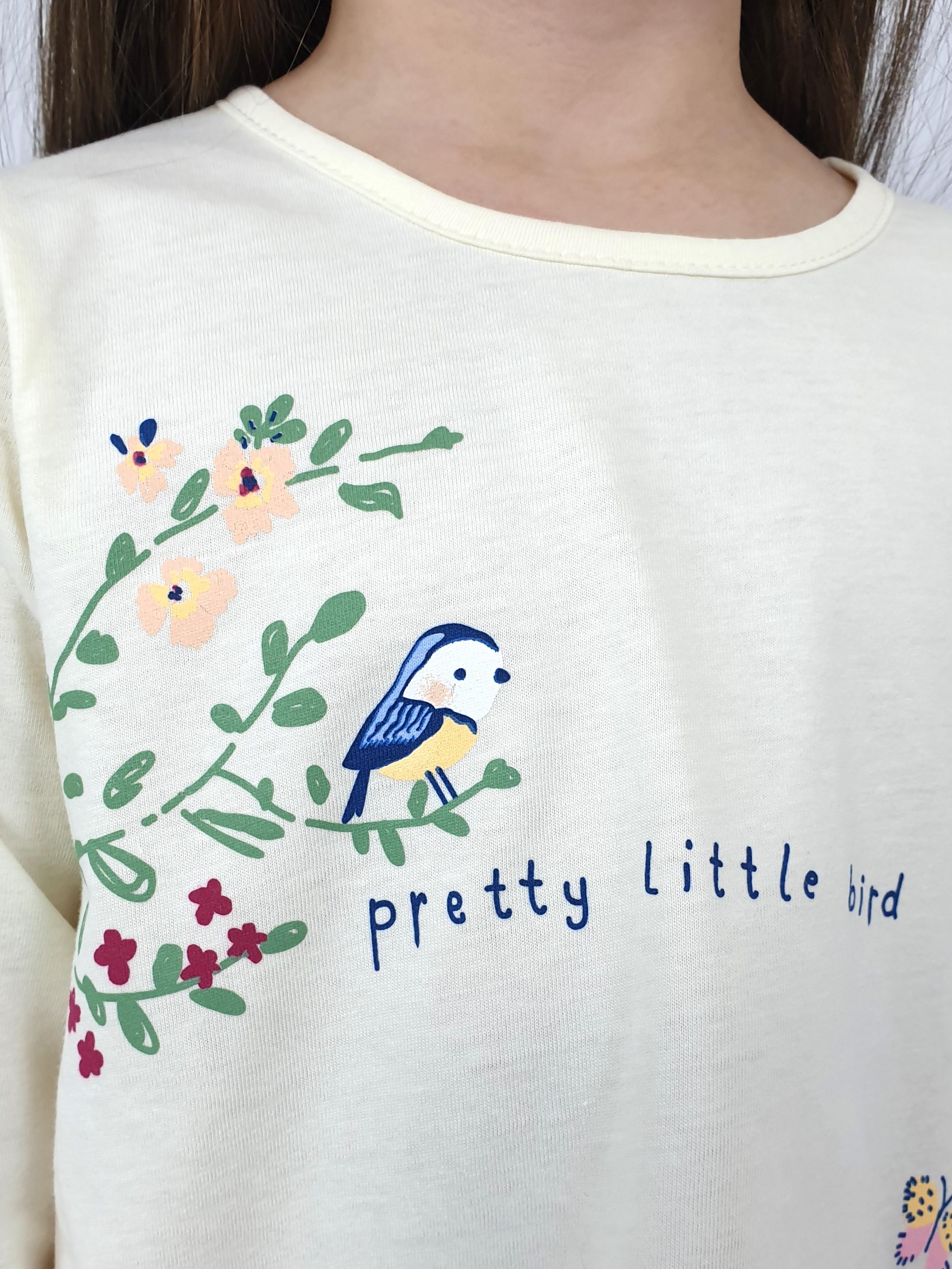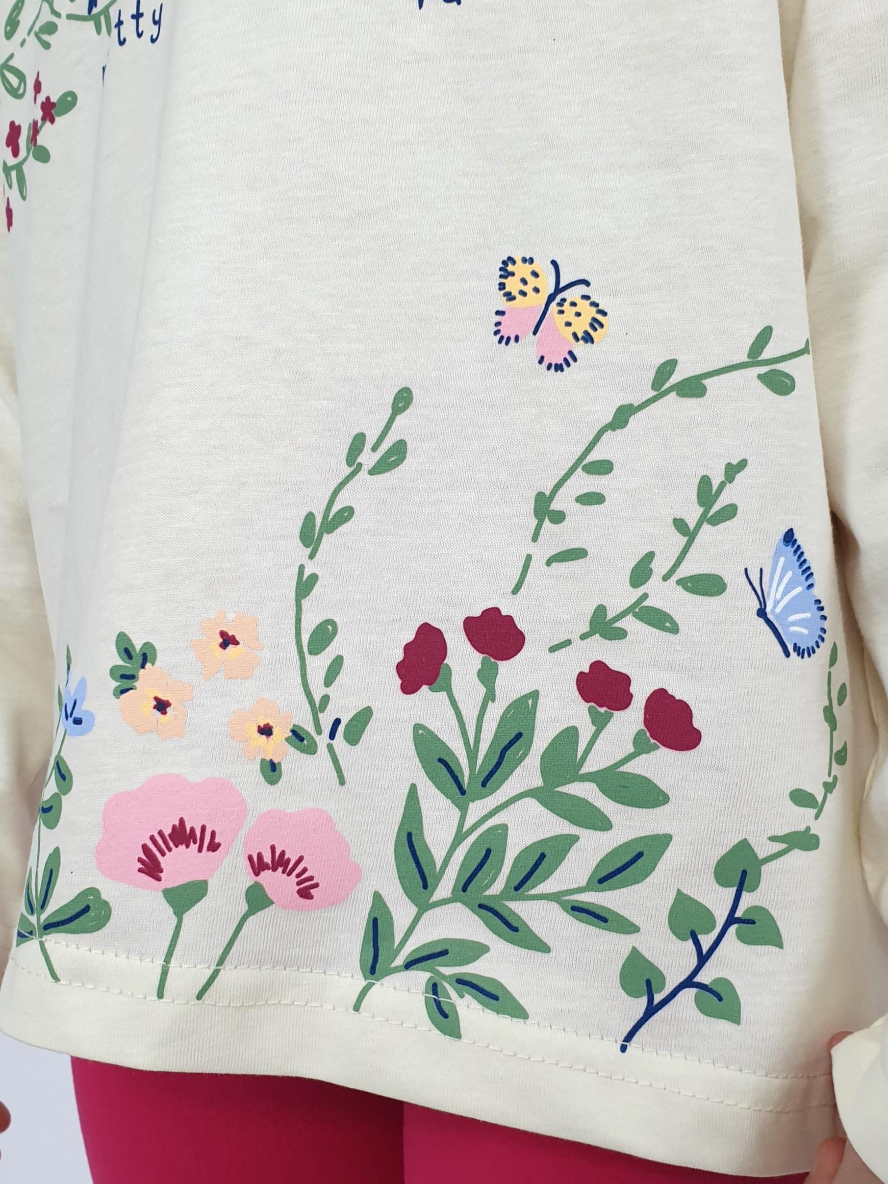 Джемпер-силуэт трапеция, удлиненная спинка со сборкой из под кокетки. Рукав втачной, длинный. Перед с печатью. Горловина окантована, застежка по спинке на кнопки. Лосины-длинные, вверху на резинке.