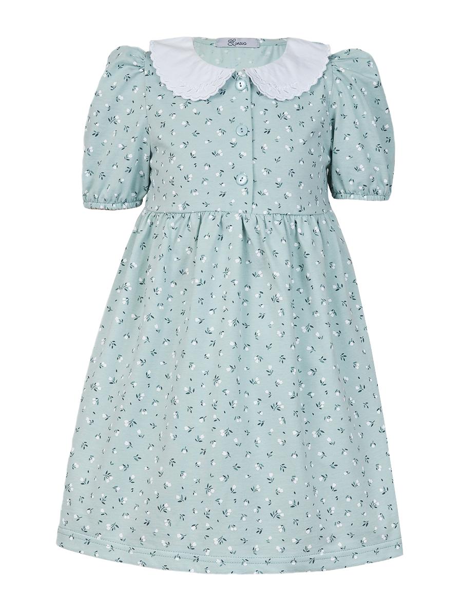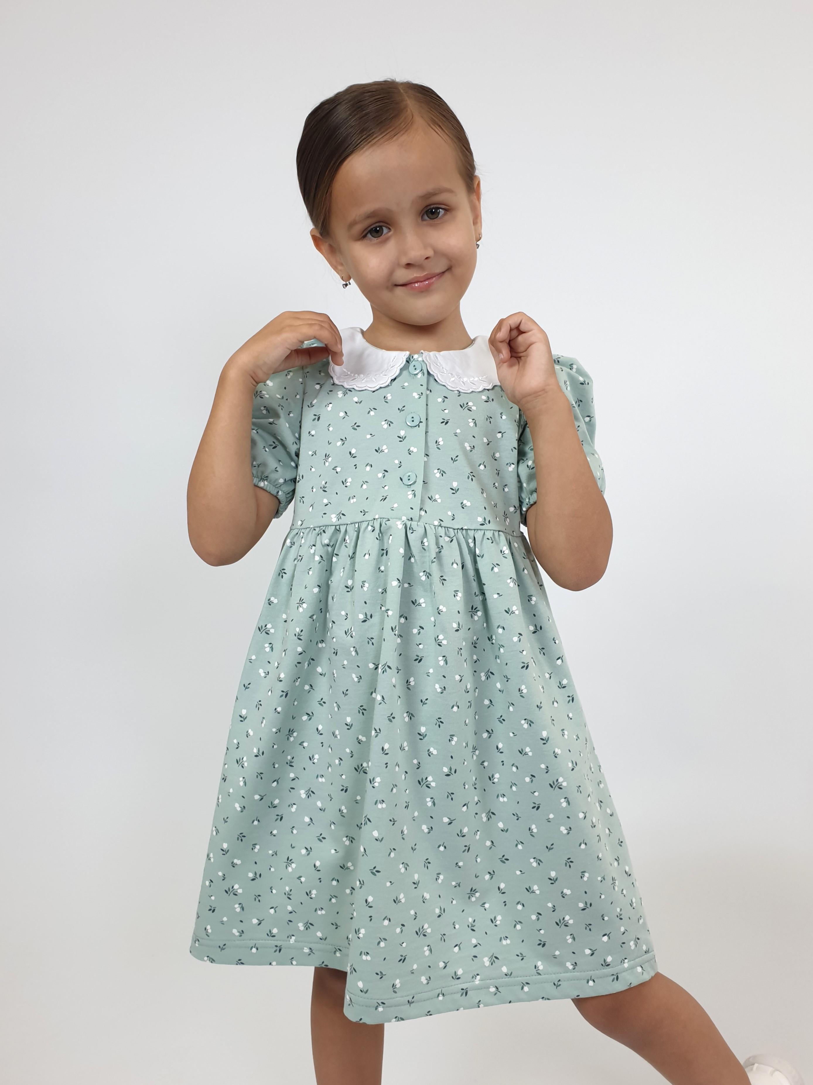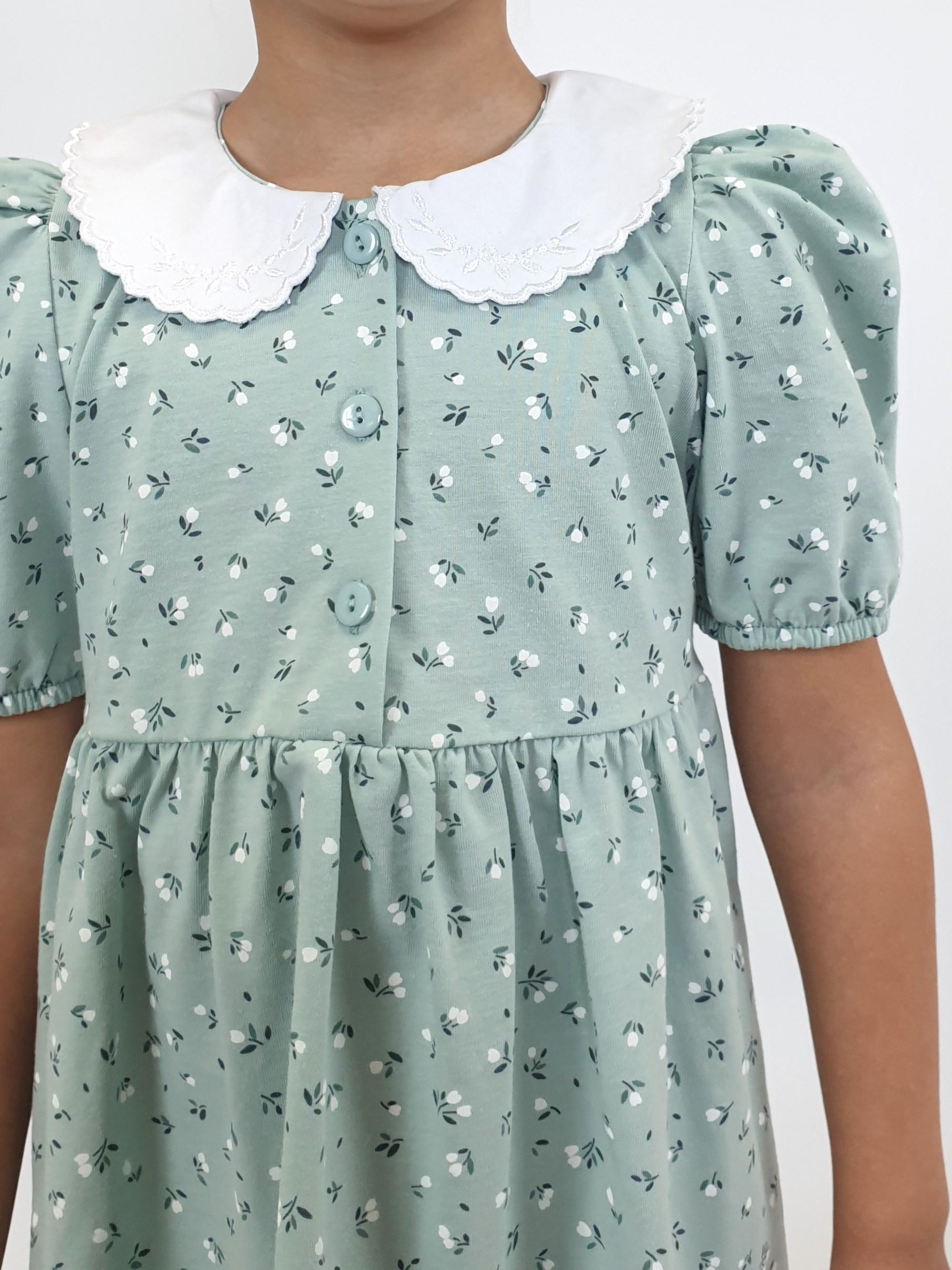 Платье-с отрезной юбкой в сборку. Короткий рукав с резинкой внизу, сборка по окату. Горловина окантована и подшита. Вышитый отделочный воротник, настрочен на окантовку. Застежка центральная на пуговицы.