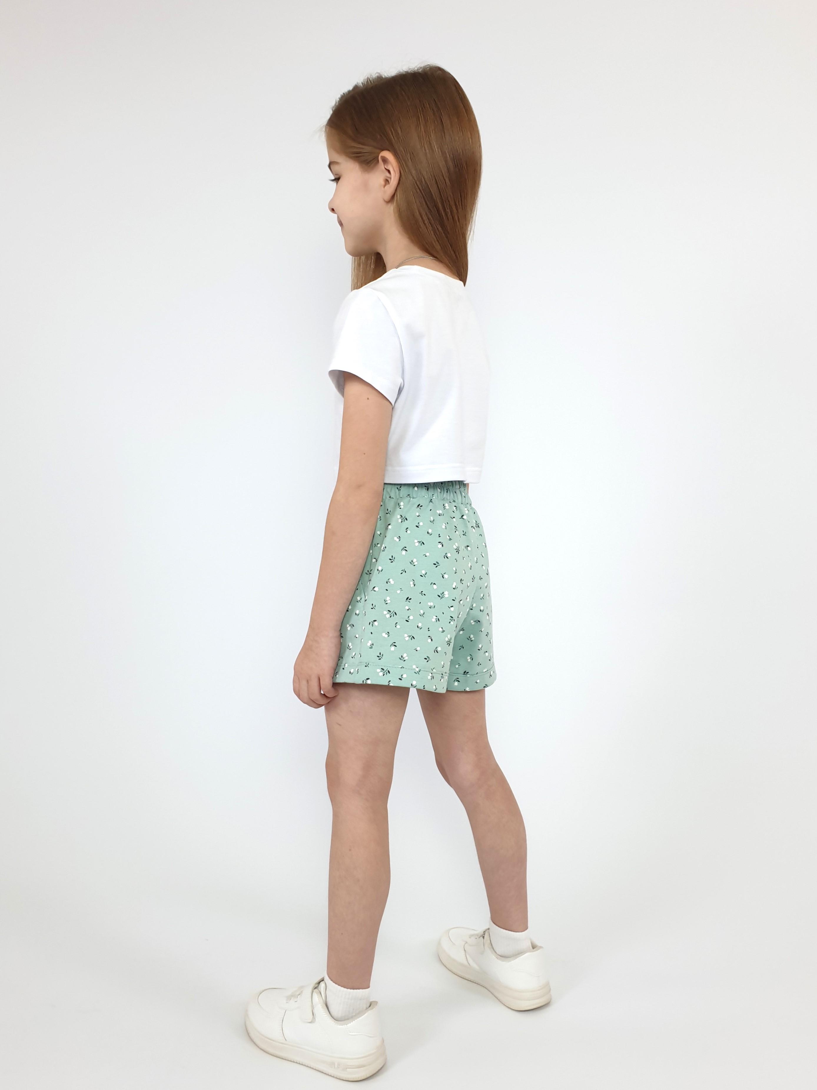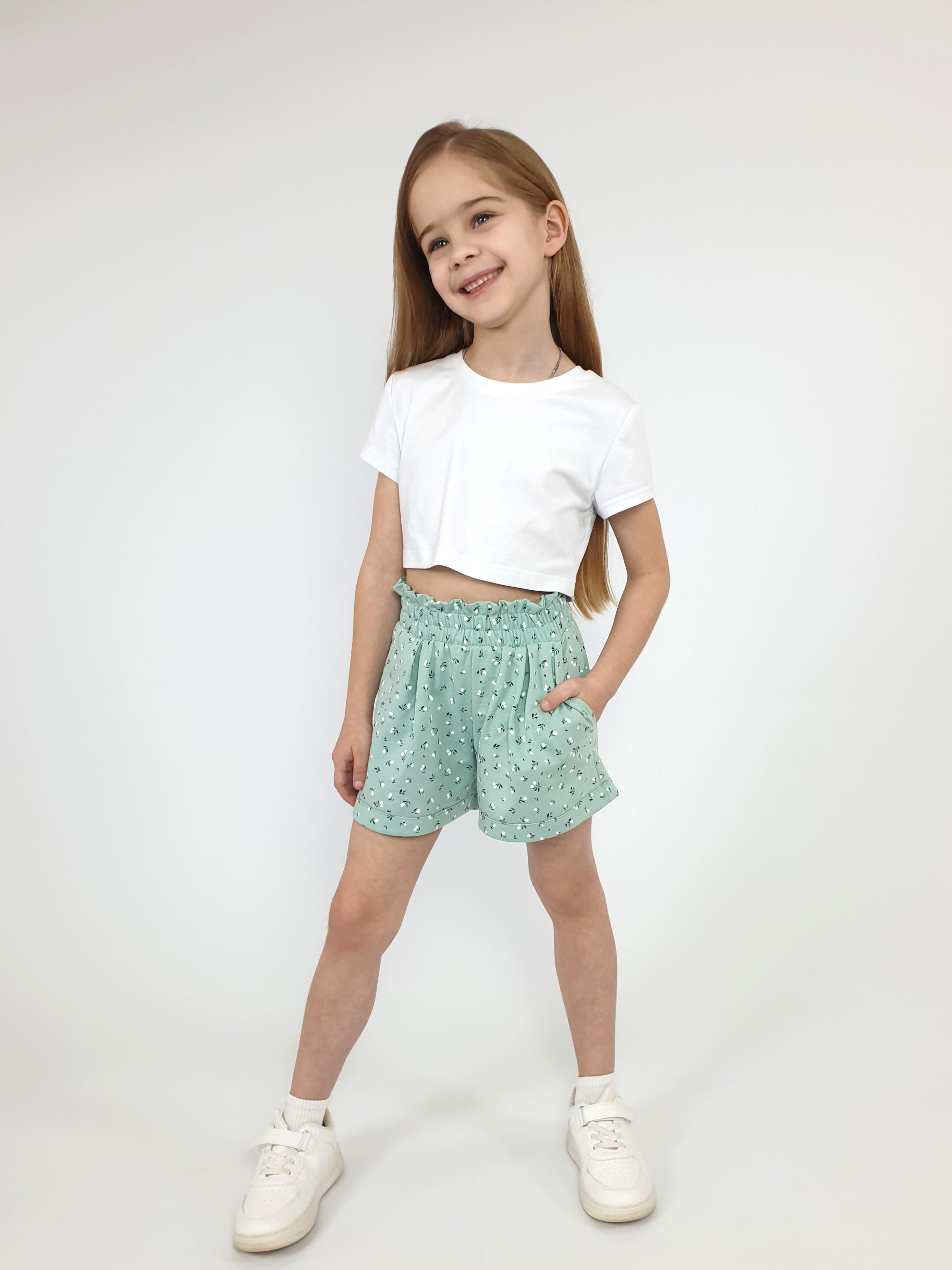 Шорты-прямые, короткие с цельнокроеными насточными манжетами. Два боковых кармана. Пояс притачной с резинкой.