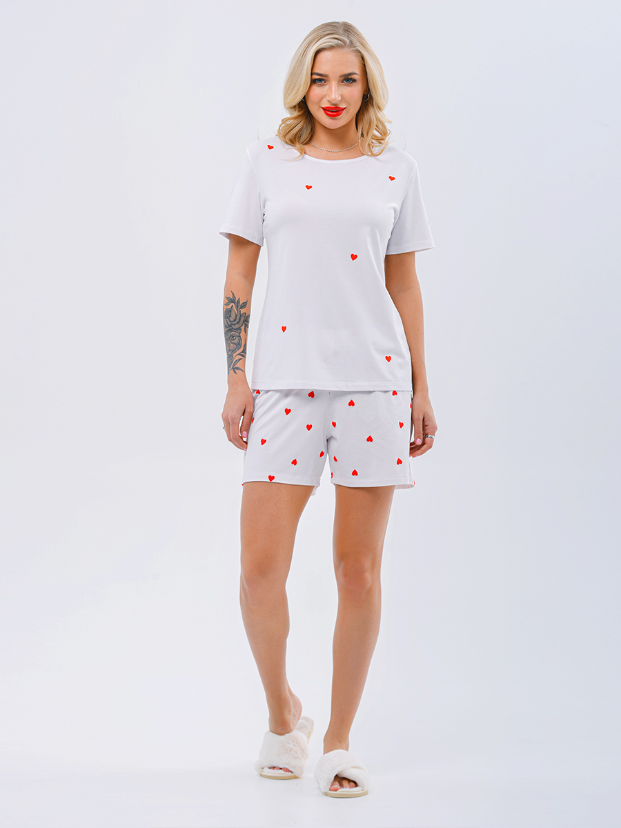 Универсальная пижама, состоящая из футболки и шортиков, выполненная из смесового полотна Rayon. В состав ткани входят хлопок, вискоза и эластан, что делает ее невероятно приятной и комфортной для тела. Полотно обладает отличной воздухопроницаемостью и гигроскопичностью, обеспечивая комфортный микроклимат во время сна и отдыха. Футболка имеет классический крой и объем , украшена яркими сердечками на полочке, добавляя игривый аспект к relax-образу. Шортики, выполненные из набивного полотна, имеют свободный крой, что обеспечивает максимальную свободу движений и комфорт. На талии предусмотрена эластичная тесьма, которая надежно фиксирует пижаму, не стесняя движений.