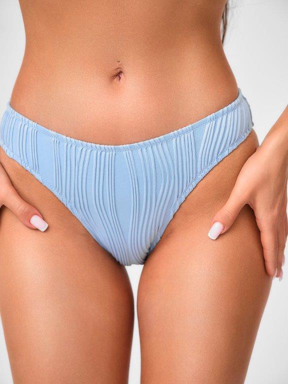 Раздельный купальник из эластичного фактурного полона, имитирующего плиссеровку, нежно голубого цвета. Мягка чашка без каркасов, с боковыми корсетными вставками и съемным вкладышем. Середина грудки украшена U-образной металлической вставкой, которая собирает материал и придает чашкам объем. Бретели съемные, завязываются на шее.На спинке металлическая застежка.Плавки со средней посадкой, на подкладке. По линии талии и вырезу ножек подгиб и плоский шов с резинкой.