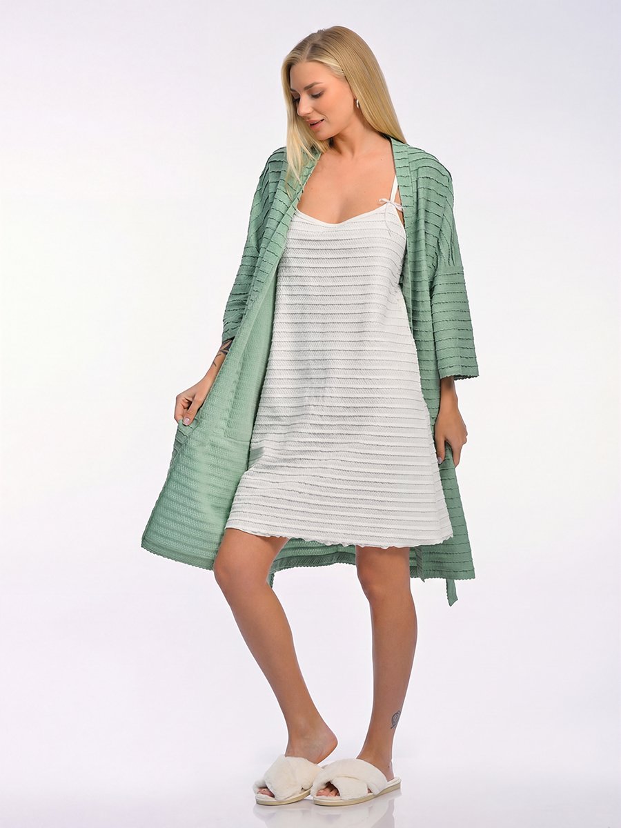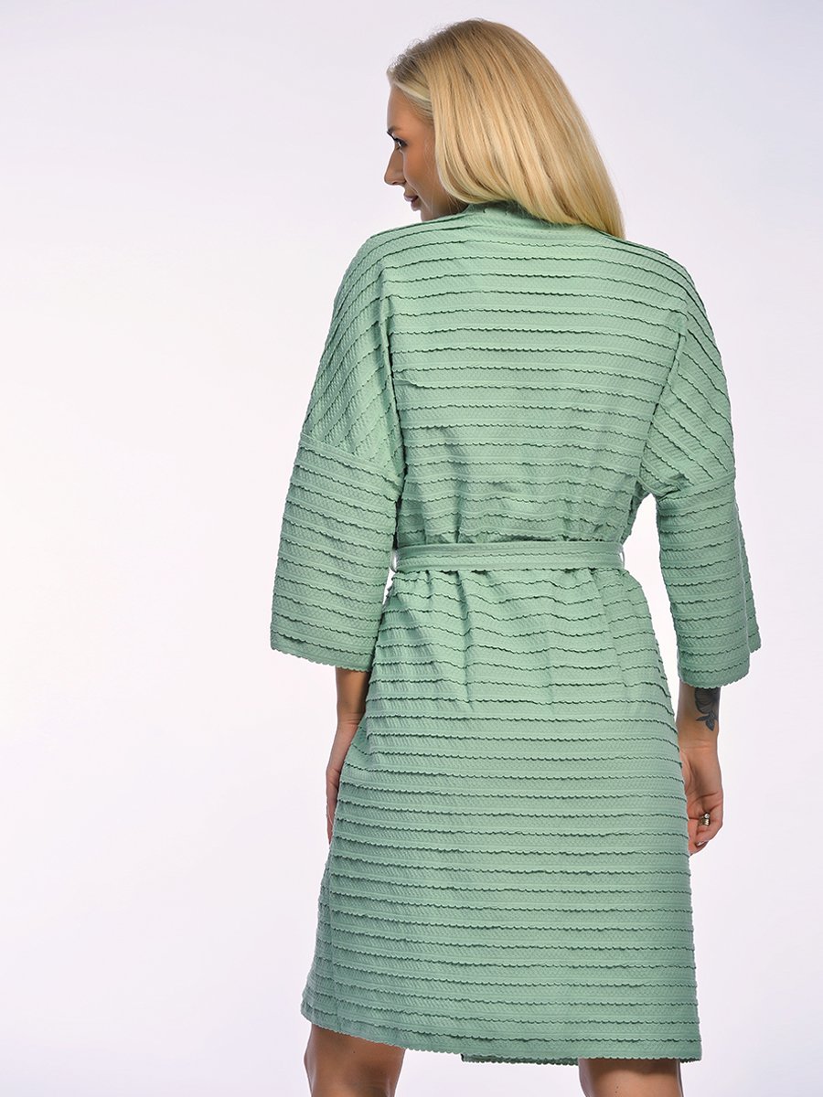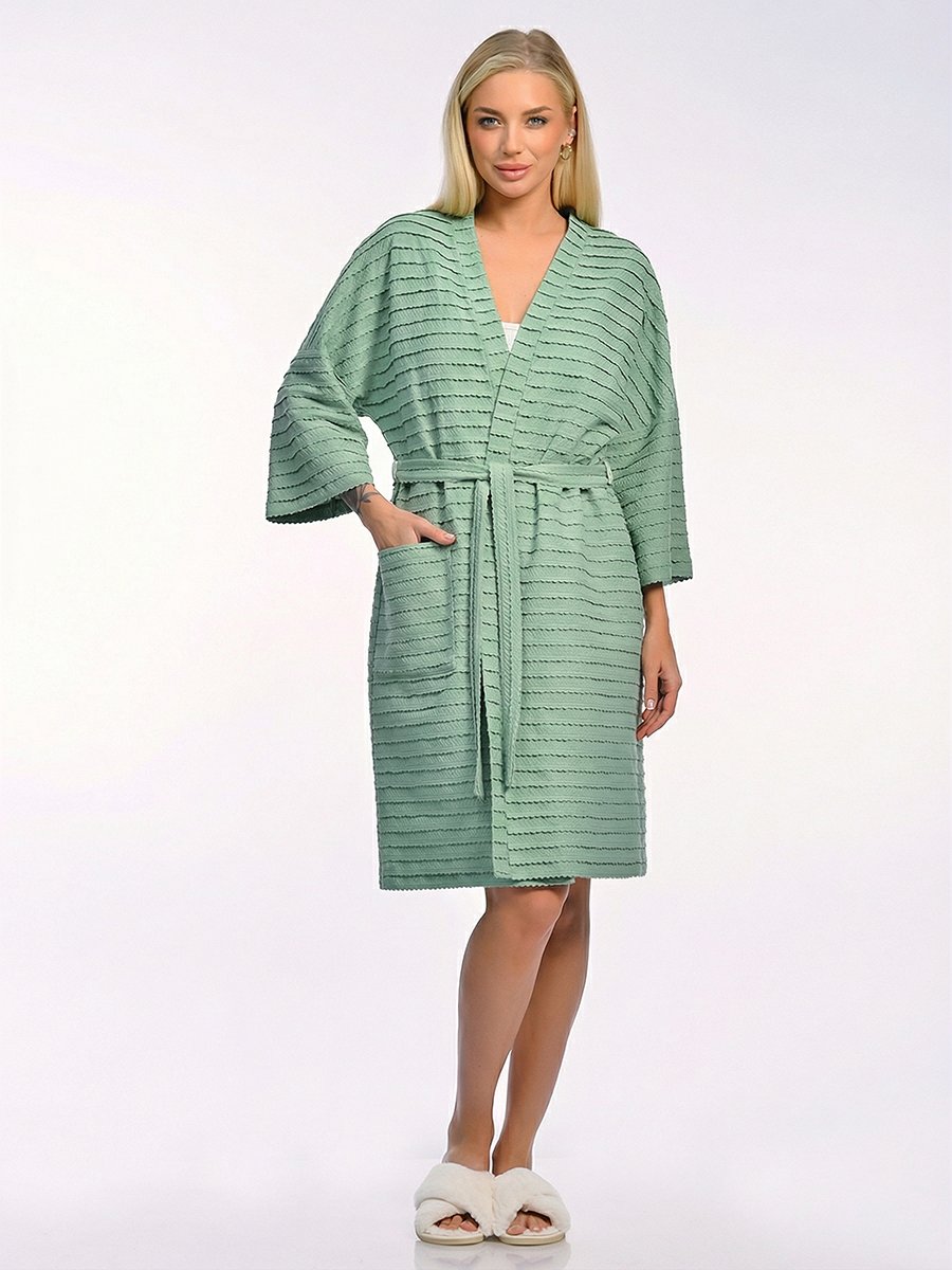 Свободный крой с расширенными рукавами три четверти делает модель универсальной — халат красиво смотрится